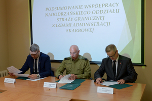 20 kwietnia 2018 r. w Komendzie Nadodrzańskiego Oddziału Straży Granicznej w Krośnie Odrzańskim gen. bryg. SG Wojciech Skowronek - Komendant Nadodrzańskiego Oddziału Straży Granicznej oraz Pan Adam Andrzejewski - Dyrektor Izby Administracji Skarbowej w Zielonej Górze oraz Pan Józef Dolata - Dyrektor Izby Administracji Skarbowej we Wrocławiu podpisali porozumienia dotyczące zasad współdziałania.