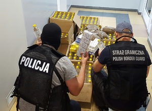 Wczoraj tj. 05.07. br., funkcjonariusze SG wraz z funkcjonariuszami z Wydziału do Walki z Przestępczością Gospodarczą KMP w Legnicy, w ramach prowadzonych działań zatrzymali 55-letniego obywatela RP., podejrzewanego o posiadanie znacznej ilości wyrobów bez polskich znaków akcyzy. Podczas przeszukania pomieszczeń mieszkalnych i gospodarczych należących do zatrzymanego mieszkańca Legnicy, ujawniono 2400 sztuk papierosów, 2,5 kg krajanki tytoniowej oraz ponad 300 litrów spirytusu bez znaków akcyzy skarbowej o łącznej wartości 30.000 zł. Na poczet przyszłych kar, związanych z naruszeniem przepisów kodeksy karno-skarbowego, funkcjonariusze zabezpieczyli gotówkę w wysokości 10.000 zł. Ujawniony towar oraz zatrzymany mężczyzna, pozostają w dyspozycji funkcjonariuszy Policji, którzy prowadzą dalsze czynności w tej sprawie.