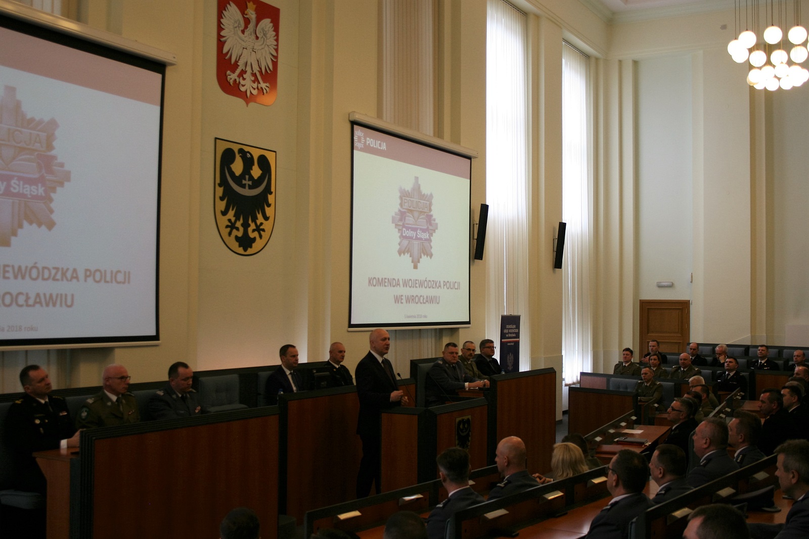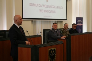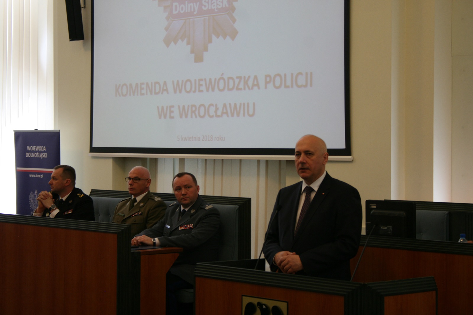 Wszystkich obecnych przywitał Wojewoda Dolnośląski Paweł Hreniak, który podczas swojego wystąpienia wskazał, że zadania w zakresie zapewnienia bezpieczeństwa mieszkańcom regionu są realizowane, a współpraca ze wszystkimi służbami układa się wręcz modelowo.