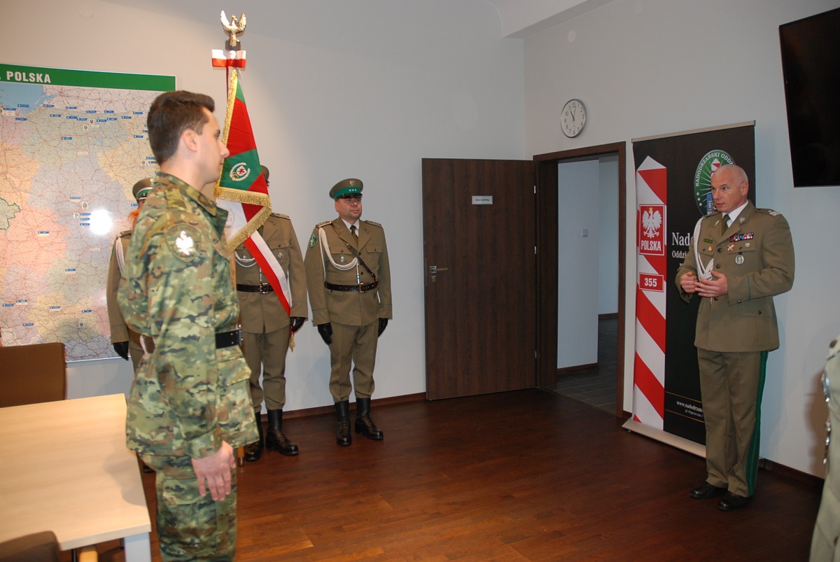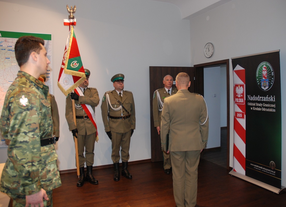 Komendant Nadodrzańskiego Oddziału przywitał nowych funkcjonariuszy w szeregach Straży Granicznej. Nawiązał do słów roty ślubowania podkreślając jej znaczenie oraz znaczenie słowa służba. Życzył wszystkim nowo przyjętym funkcjonariuszom satysfakcji z pełnienia służby w Straży Granicznej.