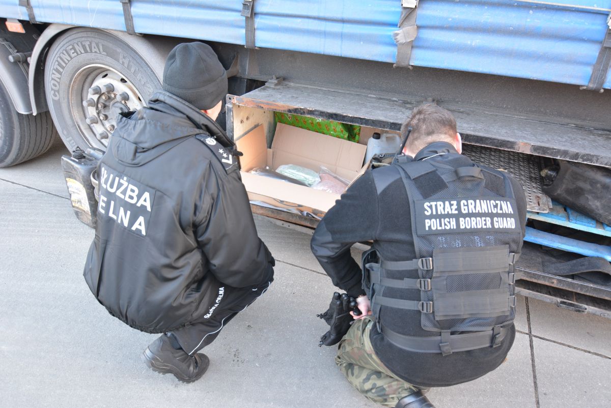 Do dokładnego zlokalizowania ukrytego ładunku wykorzystano również psy służbowe Straży Granicznej i Służby Celnej. Dzięki pomocy Aro (SG) i Carlosa (SC) w zamontowanej pod podwoziem naczepy metalowej skrzyni ujawniono worki foliowe z suszem roślinnym i tabletkami. Przeprowadzone badanie potwierdziło, że są to tabletki extasy i marihuana. Funkcjonariusze zabezpieczyli ponad 20 tysięcy tabletek extasy i ponad 13,5 kilograma marihuany. Łączna wartość ujawnionych narkotyków to 521 tysięcy złotych.