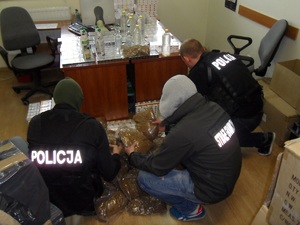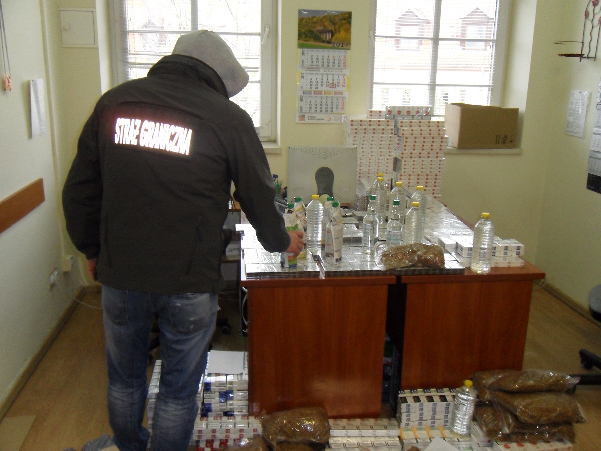 Wczoraj tj. 06.04. br. funkcjonariusze z Placówki Straży Granicznej w Legnicy wraz z funkcjonariuszami Wydziału do Walki z Przestępczością Gospodarczą KMP w Legnicy podczas przeszukania punktu sprzedaży, pojazdów orazpomieszczeń mieszkalnych ujawnili i zabezpieczyli na terenie powiatu legnickiego 40 800 sztuk papierosów różnych marek, 24 kg tytoniu oraz około 11 litrów spirytusu o szacunkowej wartości około 50 tys złotych. Straty Skarbu Państwa szacuje się na około 60 tys złotych. Na miejscu zdarzenia zatrzymano 2 ob. RP, mieszkańców Legnicy w wieku 66 oraz 41 lat. Ujawniony towar oraz zatrzymani obywatele RP pozostają w dyspozycji funkcjonariuszy KMP w Legnicy, którzy prowadzą dalsze czynności w tej sprawie.