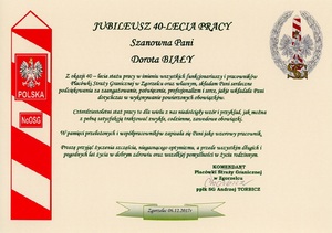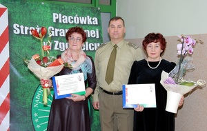 Komendant Placówki SG w Zgorzelcu ppłk Andrzej Torbicz w imieniu swoim, Komendanta Nadodrzańskiego Oddziału SG, Związku Zawodowego Pracowników Cywilnych MSWiA, a także wszystkich funkcjonariuszy i pracowników, wręczając listy gratulacyjne i kwiaty, podziękował Paniom Teresie Szydłowskiej oraz Dorocie Biały za obowiązkowość i rzetelne podejście do wykonanych na co dzień obowiązków oraz złożył najserdeczniejsze życzenia zdrowia, satysfakcji z pracy, a także kolejnych jubileuszy oraz pomyślności na kolejnych etapach życia zawodowego i prywatnego.