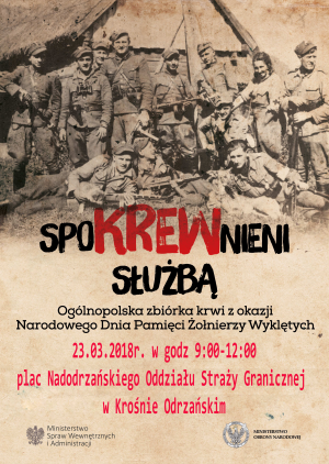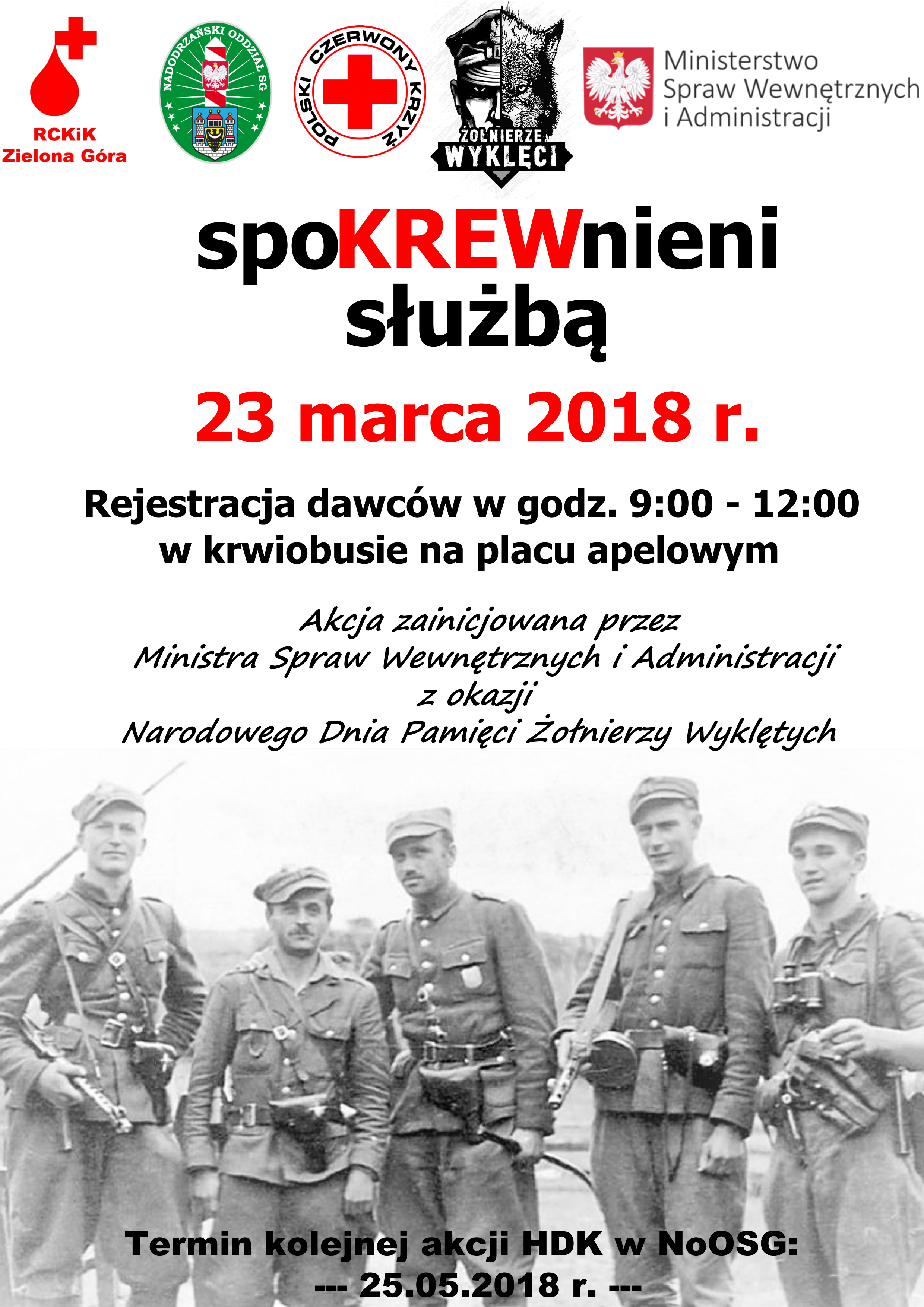 Akcja „SpoKREWnieni służbą” pod patronatem Ministra Spraw Wewnętrznych i Administracji oraz Ministra Obrony Narodowej trwać będzie przez cały marzec. W ramach akcji przedstawiciele polskich służb mundurowych, w hołdzie Żołnierzom Wyklętym, oddają krew chorym i ofiarom wypadków. Przeprowadzenie honorowej zbiórki krwi będzie miało miejsce w piątek 23 marca br. w siedzibie Nadodrzańskiego Oddziału Straży Granicznej w godzinach 9:00-12:00. Zbiórkę krwi przeprowadzać będzie personel medyczny z Regionalnego Centrum Krwiodawstwa i Krwiolecznictwa w Zielonej Górze. Przypominamy, że zbiórka ma charakter otwarty i mogą się do niej włączyć nie tylko funkcjonariusze służb mundurowych, ale także wszyscy chętni.
