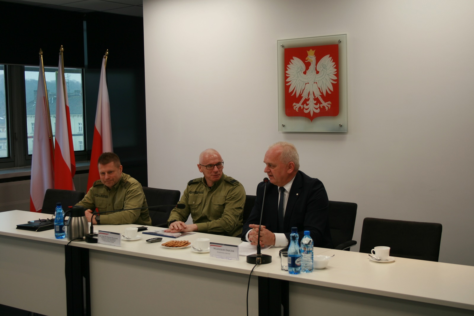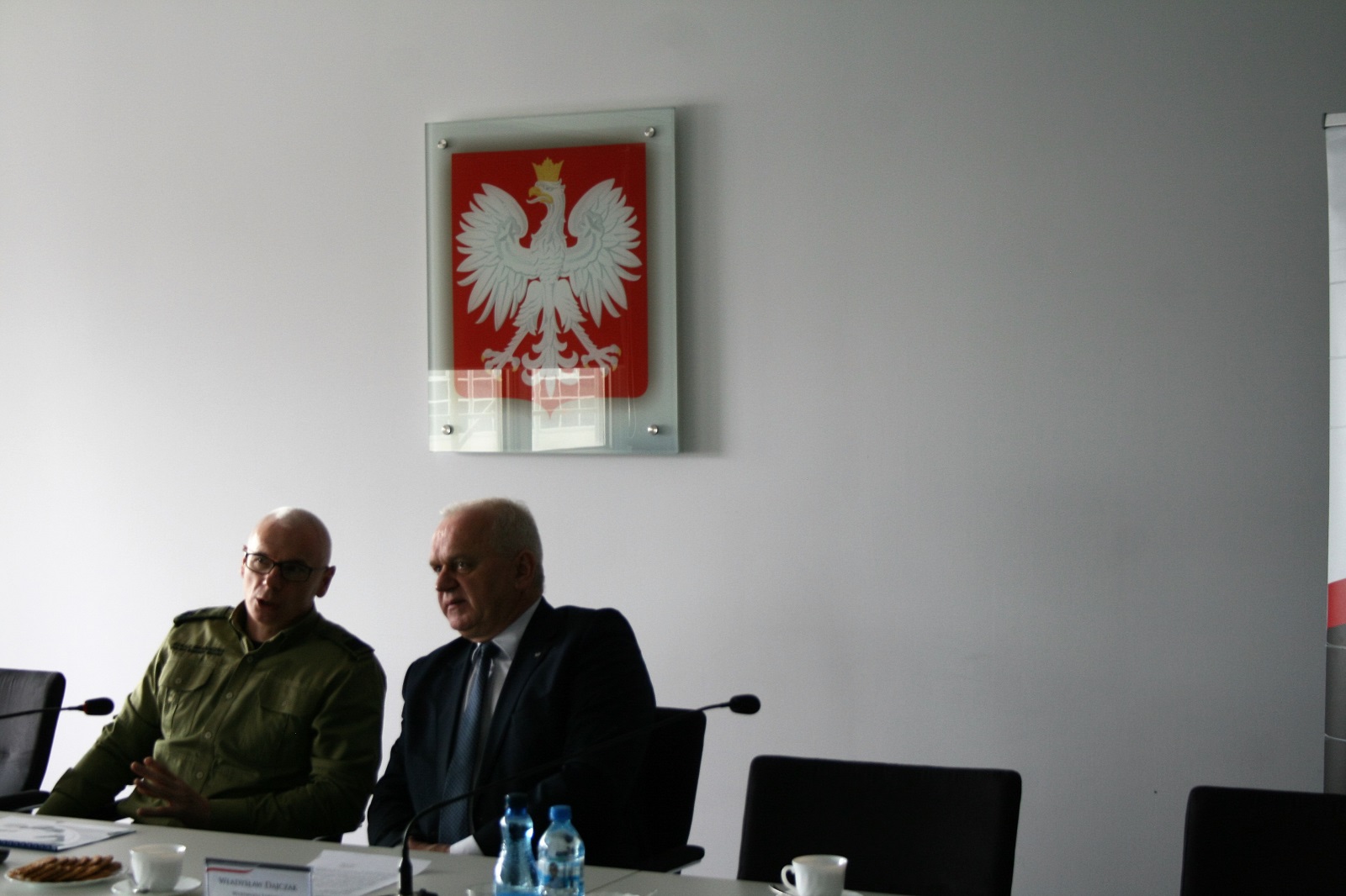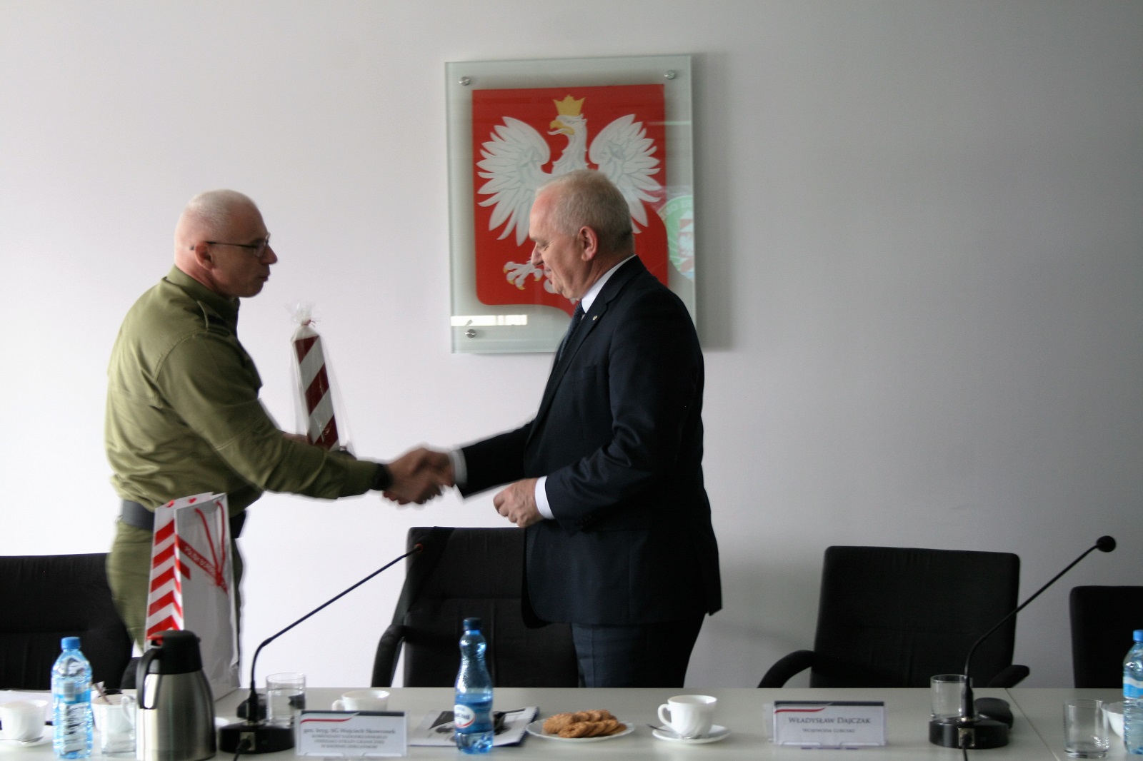 Komendant NoOSG gen.bryg. SG Wojciech Skowronek wręczając pamiątkowy znak graniczny podziękował Wojewodzie Lubuskiemu Władysławowi Dajczakowi za zaangażowanie i pomoc udzielaną funkcjonariuszom NoOSG.
