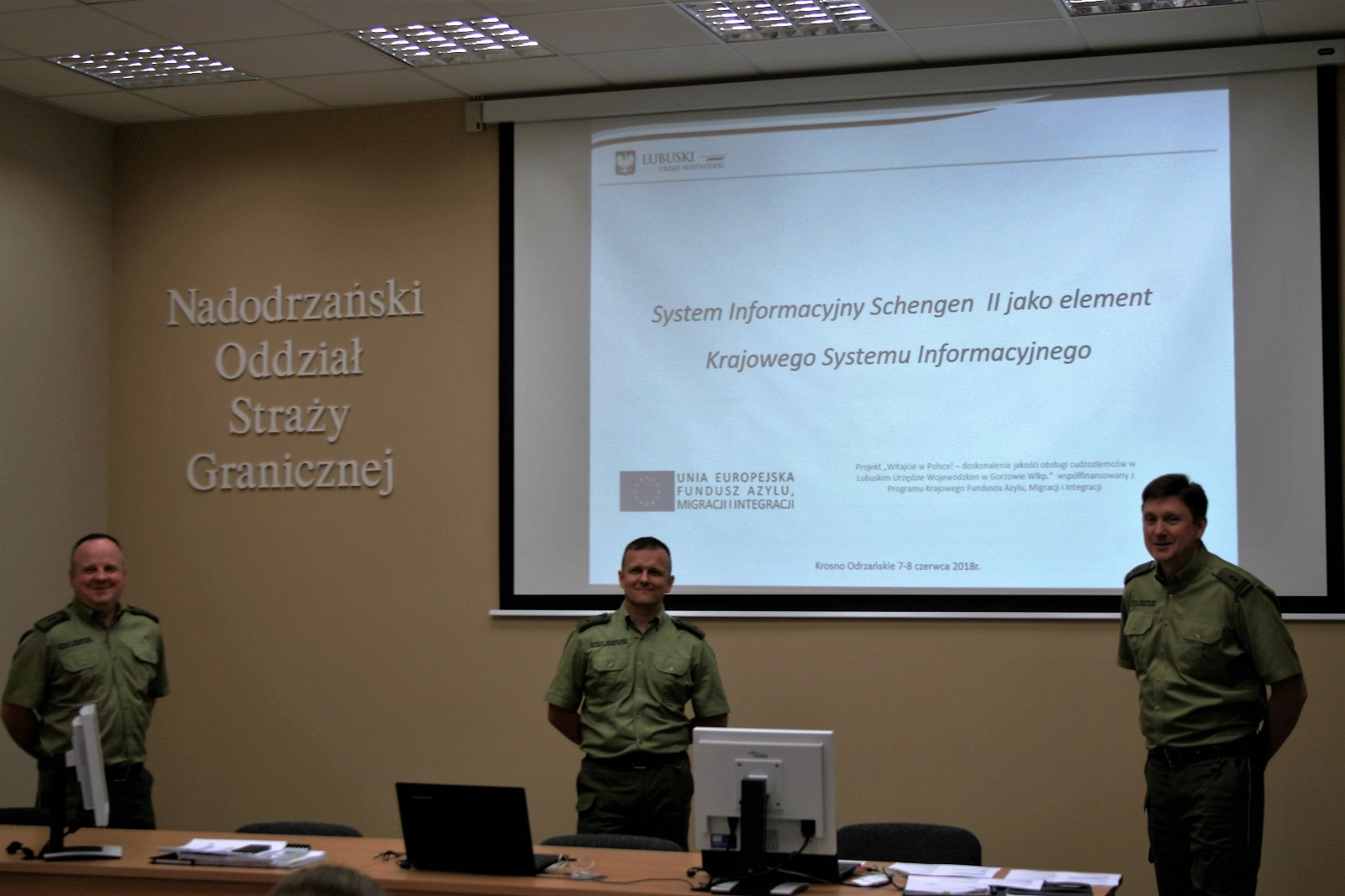 Zarówno funkcjonariusze Straży Granicznej jak i urzędnicy wydziałów Spraw Obywatelskich i Cudzoziemców weryfikują legalny pobyt cudzoziemców na terytorium naszego kraju. Aby mogli sprawnie i skutecznie wykonywać swoje obowiązki, dokonują sprawdzeń w Systemie Informatycznym Schengen drugiej generacji (SIS II) oraz Wizowym Systemie Informacyjnym VIS. Dwudniowe spotkanie dedykowane było urzędnikom Wydziału Spraw Obywatelskich i Cudzoziemców Lubuskiego Urzędu Wojewódzkiego i dotyczyło podstaw prawnych, obowiązujących procedur, nowych funkcjonalności, a także praktycznych aspektów korzystania z Systemu Informatycznego Schengen drugiej generacji (SIS II) oraz Wizowego Sytemu Informacyjnego VIS. Podczas szkolenia funkcjonariusze SG oraz pracownicy LUW dokonali wspólnej wymiany doświadczeń oraz dobrych praktyk związanych z pracą z cudzoziemcami oraz sprawdzeniami dokonywanymi w systemach teleinformatycznych. Urzędnicy zapoznali się również z zasadami funkcjonowania Strzeżonego Ośrodka dla Cudzoziemców w Krośnie Odrzańskim, który odwiedzili w ramach szkolenia.
