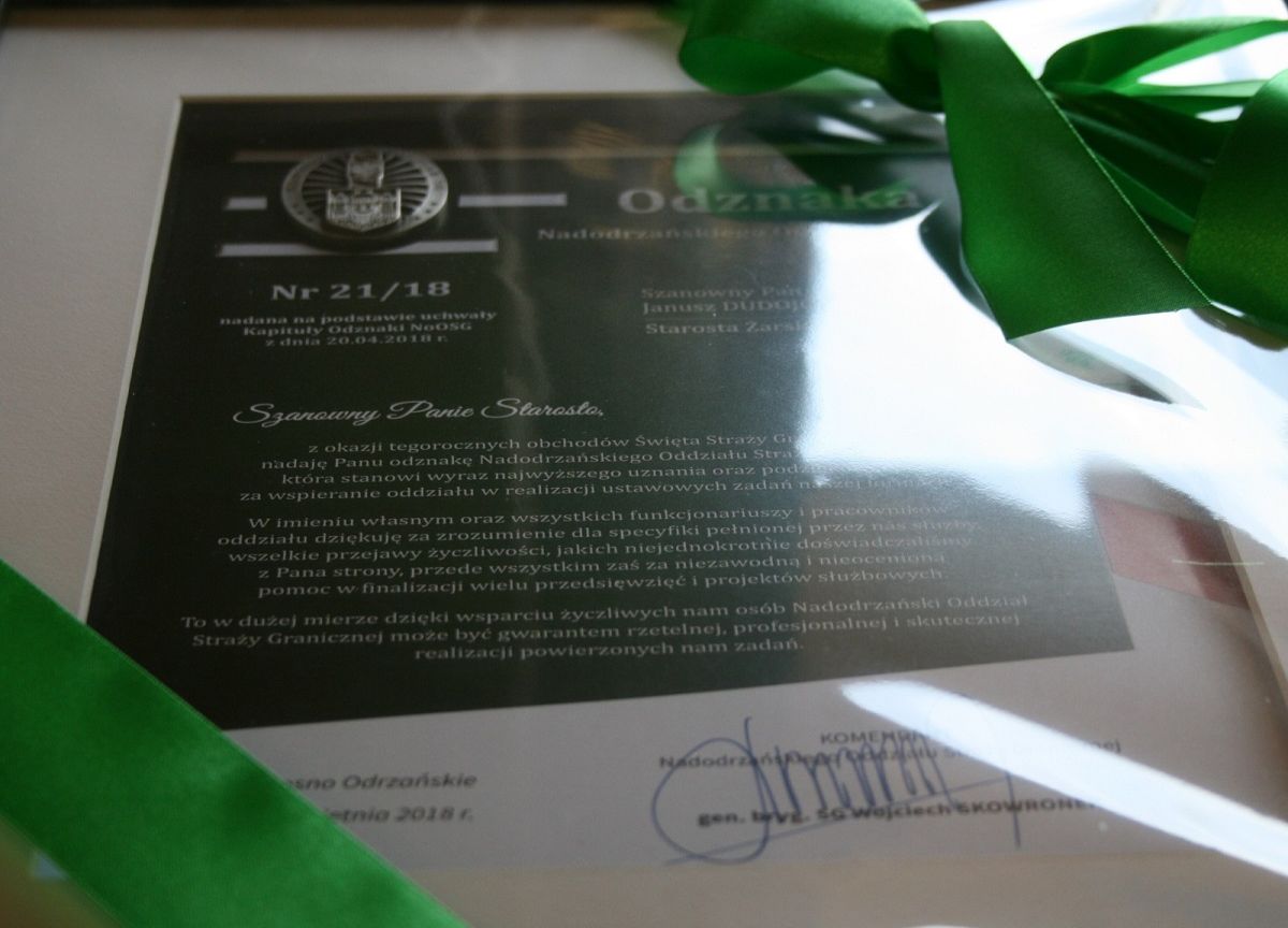 W spotkaniu wziął udział również Komendant Placówki SG w Tuplicach mjr SG Leszek Onuchowski. Zastępca Komendanta NoOSG wręczając Staroście Powiatu Żarskiego Januszowi Dudojć Odznakę Nadodrzańskiego Oddziału Straży Granicznej wyraziła uznanie dla działań podejmowanych przez starostwo powiatowe i radę powiatu w zakresie wsparcia funkcjonariuszy SG z Tuplic. Obie strony spotkania wysoko oceniły wzajemnie podejmowane działania, które mają pozytywny wpływ na wyniki osiągnięte przez strażników granicznych z Tuplic oraz znacząco przyczyniły się do poprawy bezpieczeństwa mieszkańców powiatu. Zastępca Komendanta NoOSG zwróciła uwagę na przychylność władz samorządowych szczebla powiatowego, podziękowała za dotychczasowe przedsięwzięcia, jak również wyraziła nadzieję na dalsze, równie owocne współdziałanie.
