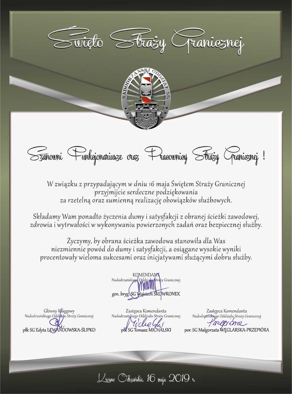 W tym roku funkcjonariusze i pracownicy Nadodrzańskiego Oddziału SG swoje święto obchodzić będą 31 maja. Uroczystość odbędzie się na terenie Komendy Nadodrzańskiego Oddziału Straży Granicznej w Krośnie Odrzańskim. W trakcie uroczystości wręczone zostaną awanse na kolejne stopnie służbowe i odznaczenia. Będzie można również wysłuchać krótkiego koncertu Orkiestry Reprezentacyjnej Sił Zbrojnychz Poznania. W trakcie uroczystości zobaczyć będzie można m.in. wystawę sprzętu służb mundurowych. Serdecznie zapraszamy do udziału w uroczystym wydarzeniu.