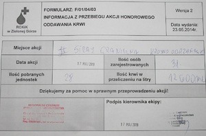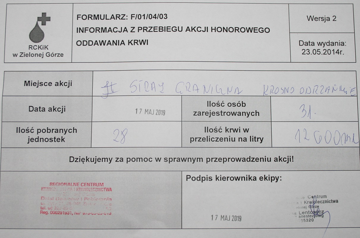 Warto przypomnieć, iż w listopadzie ubiegłego roku Nadodrzański Oddział SG otrzymał Certyfikat Firmy Promującej Honorowe Oddawanie Krwi nadany przez Dyrektora Regionalnego Centrum Krwiodawstwa i Krwiolecznictwa w Zielonej Górze za organizowanie i wspieranie idei honorowego oddawania krwi.