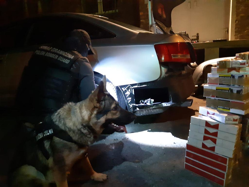 W piątek 27 września funkcjonariusze SG z placówki we Wrocławiu, współdziałając z Krajową Administracja Skarbową z Wrocławia, zatrzymali do kontroli pojazd marki Audi A6. W trakcie kontroli pies służbowy oznaczył miejsca z nielegalnym ładunkiem. 40 letni kierowca przyznał, że przewozi wyroby tytoniowe ukryte w pojeździe. Przeszukanie samochodu ujawniło ukryte w nim skrytki konstrukcyjne, w których znajdowało się 50 tys. sztuk papierosów bez polskich znaków akcyzy skarbowej. Dzień wcześniej funkcjonariusze PSG w Zielonej Górze również nie dali się zwieźć sprytnym zabezpieczeniom. Przeprowadzając kontrole na targowisku miejskim w powiecie krośnieńskim zabezpieczyli w jednym z pawilonów targowych ponad 21 tys. sztuk nielegalnych papierosów ukrytych w ścianie. Zatrzymana właścicielka nielegalnych wyrobów przyznała się do ich posiadania.