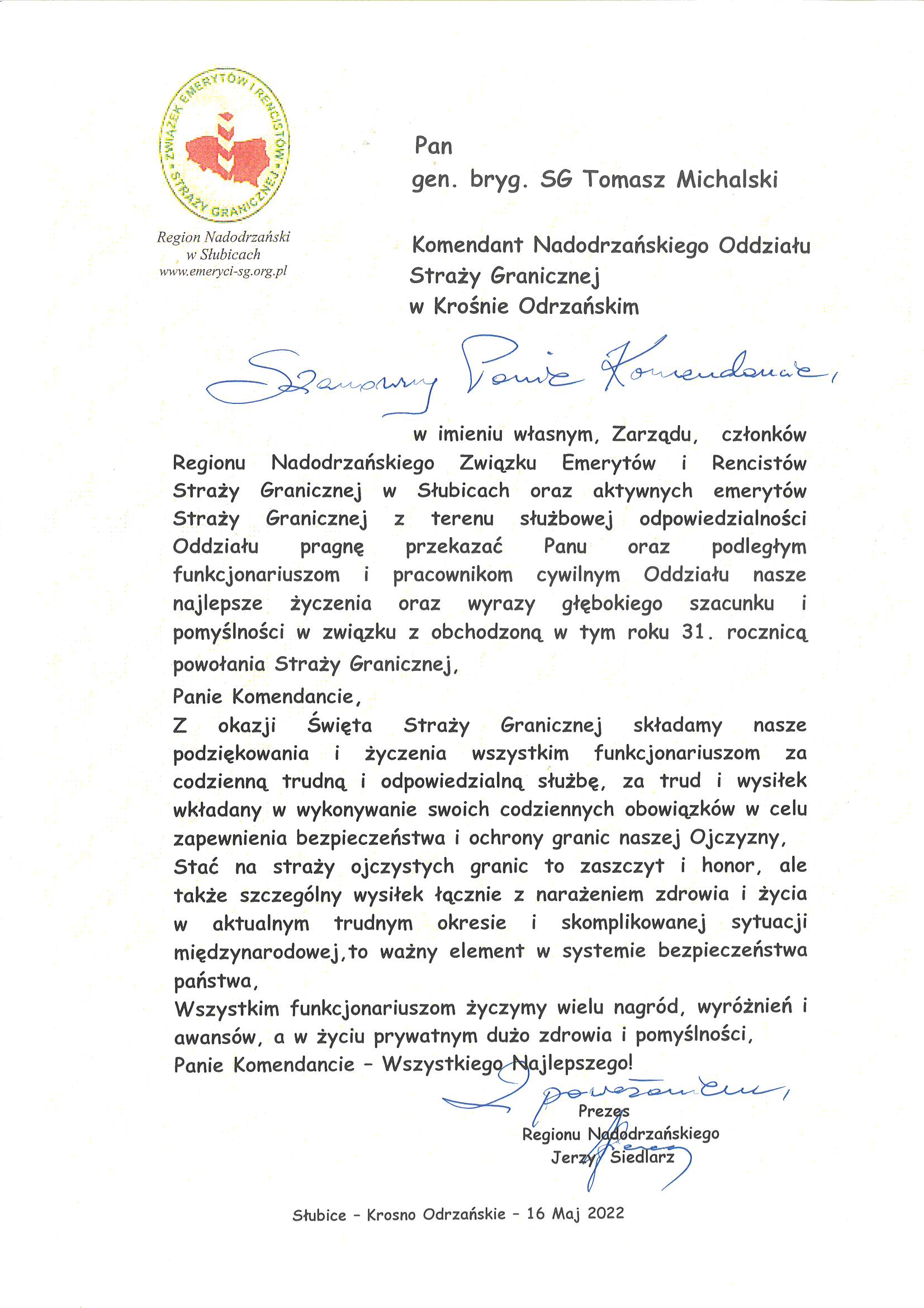 Życzenia skierowane przez Prezesa Regionu Nadodrzańskiego ZEiR SG -