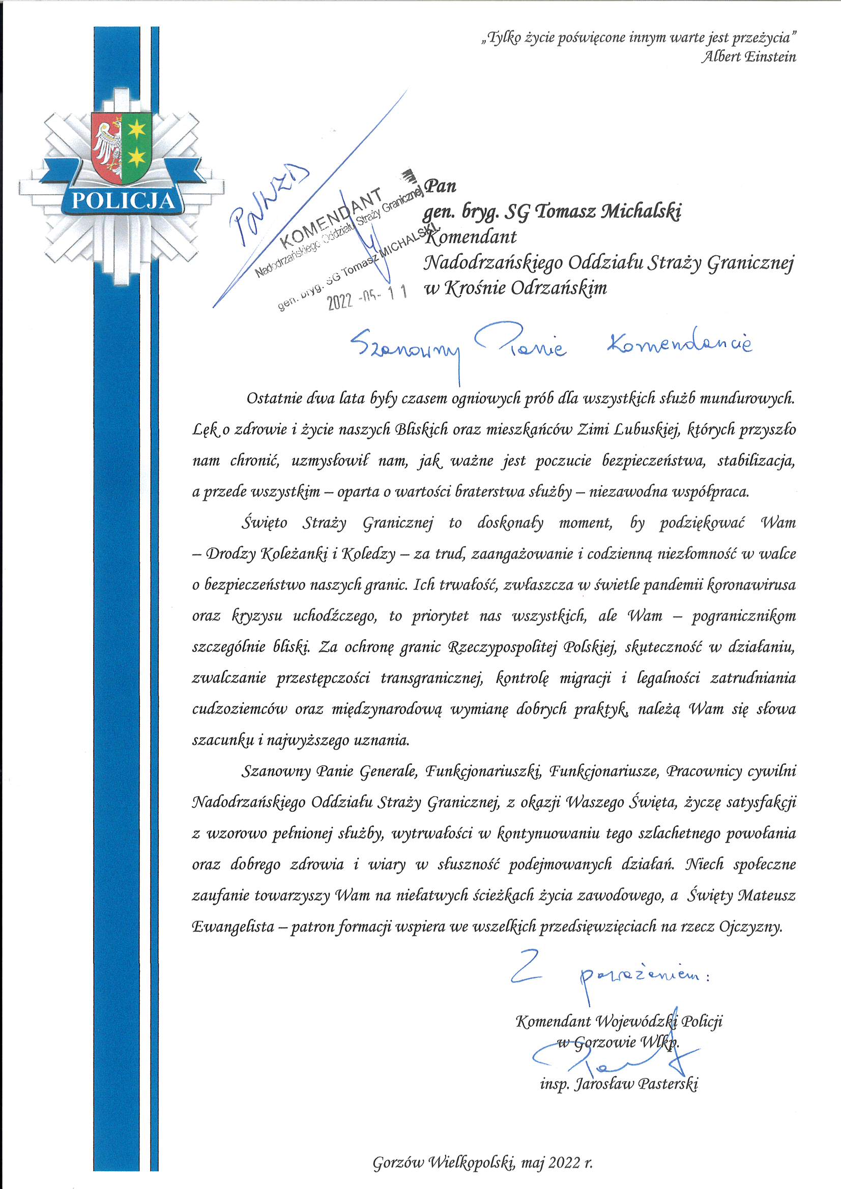 Życzenia skierowane przez Komendanta Wojewódzkiego Policji w Gorzowie Wielkopolskim -