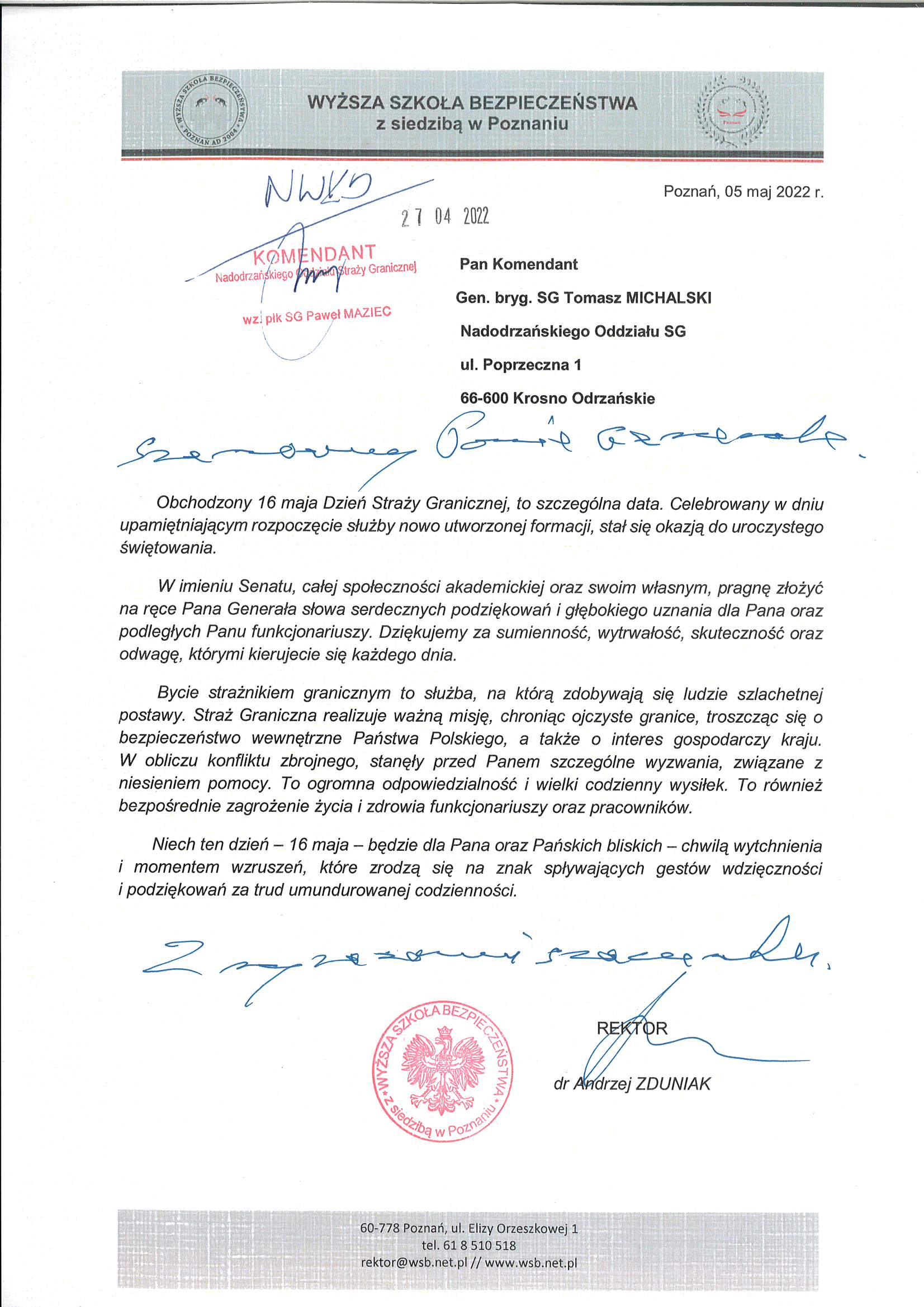 Życzenia skierowane przez Rektora Wyższej Szkoły Bezpieczeństwa z siedzibą w Poznaniu -
