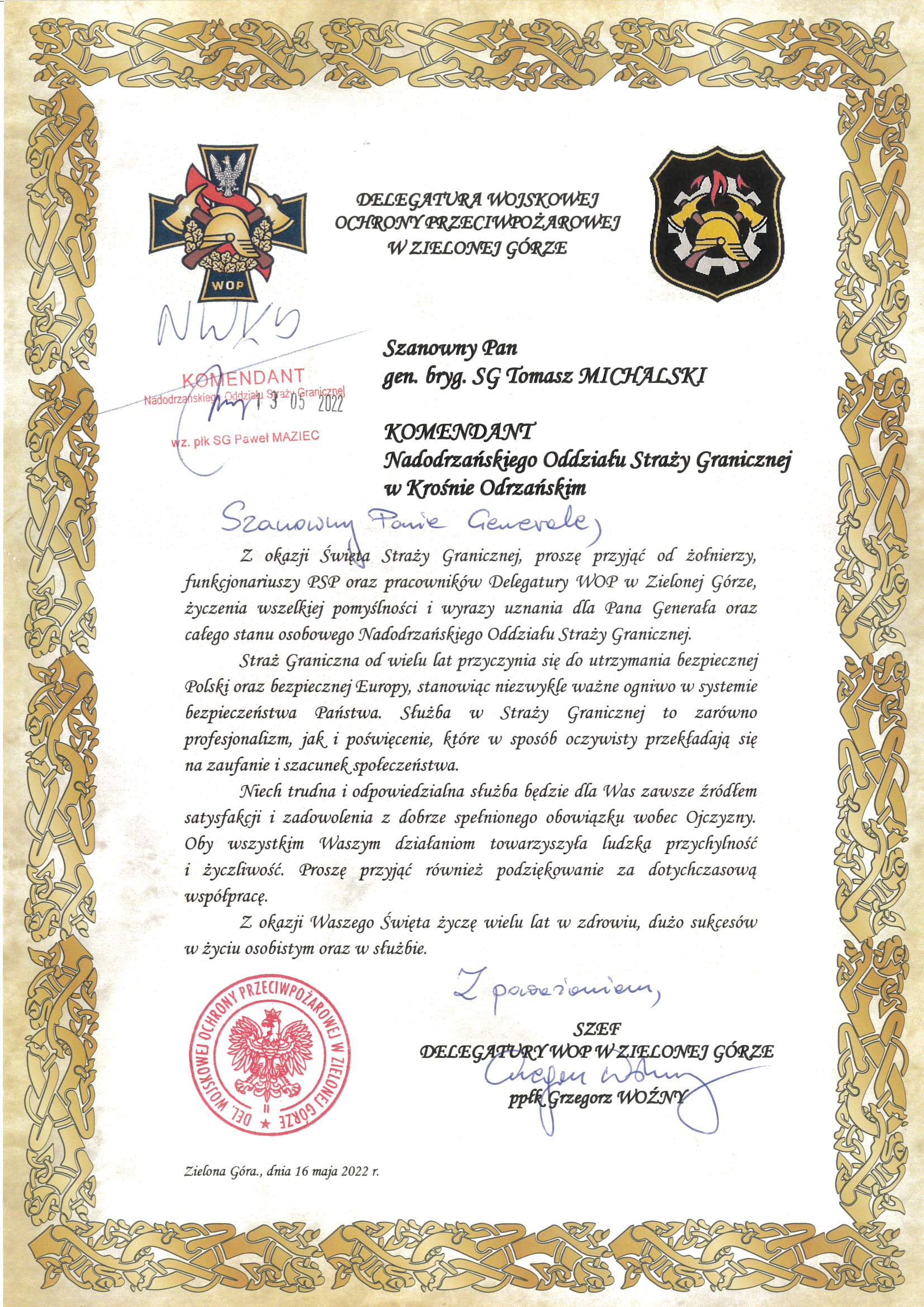 Życzenia skierowane przez Szefa Delegatury Wojskowej Ochrony Przeciwpożarowej w Zielonej Górze -