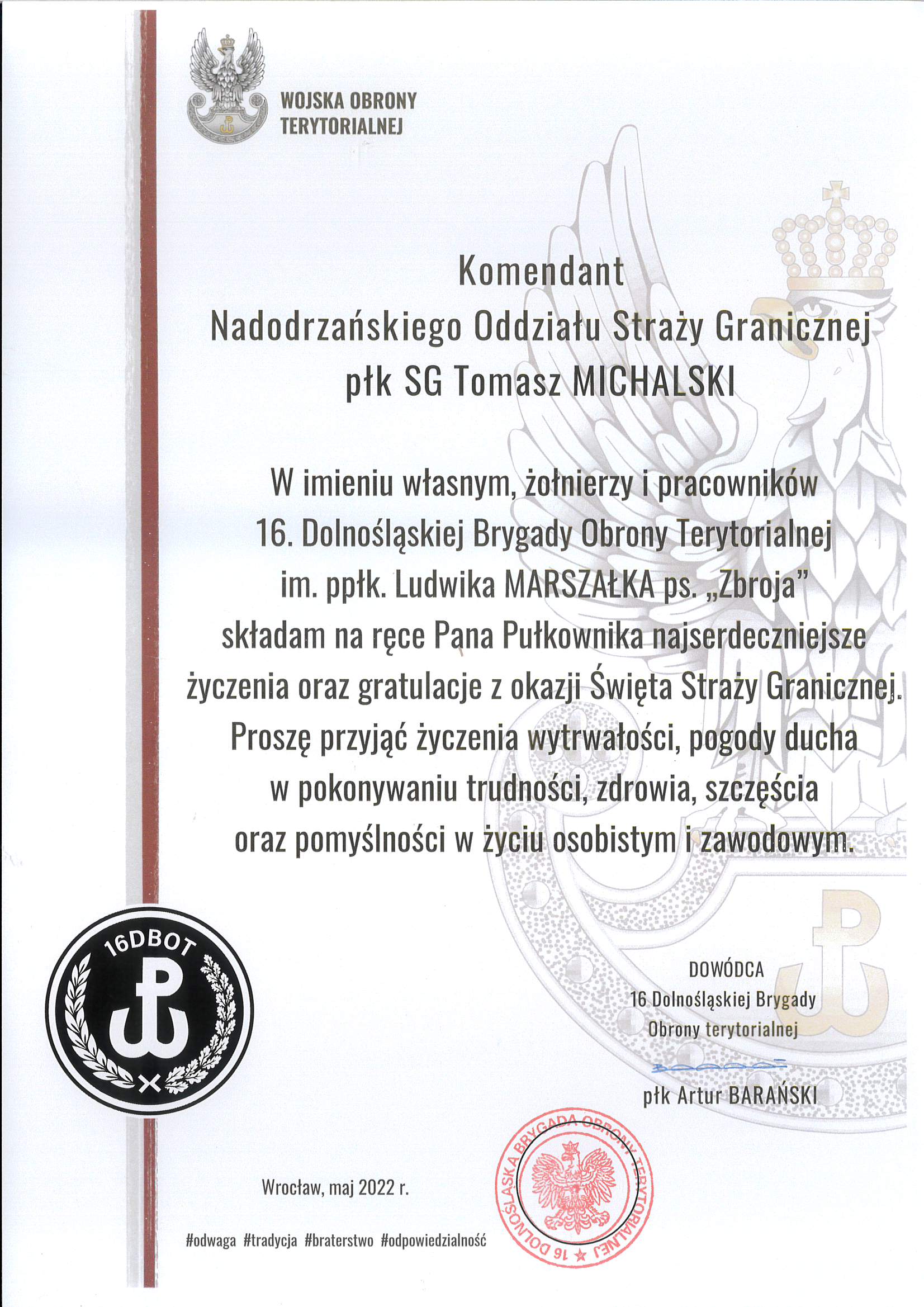 Życzenia skierowane przez Dowódcę 16 Dolnośląskiej Brygady Obrony Terytorialnej -