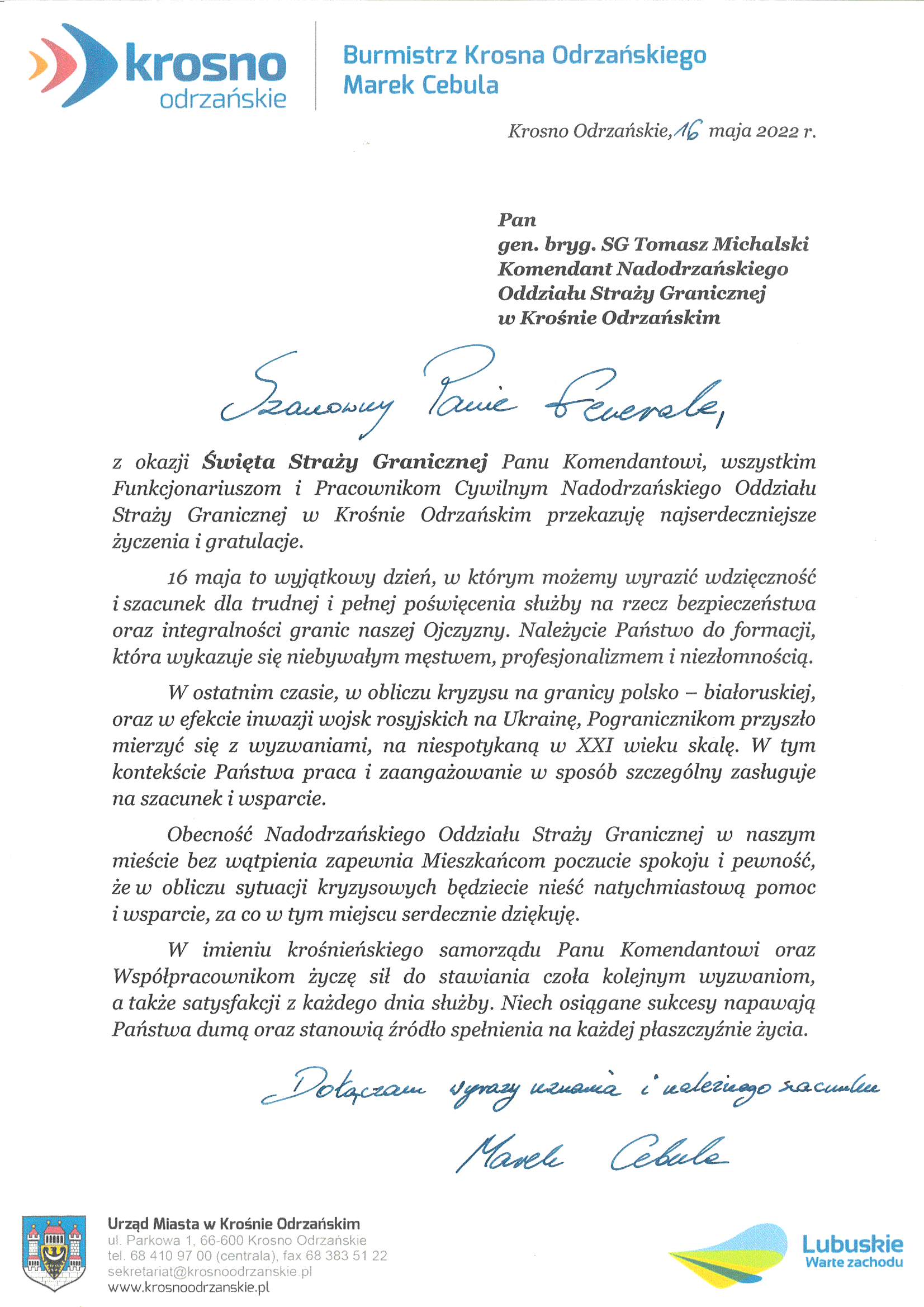 Życzenia skierowane przez Burmistrza Krosna Odrzańskiego -