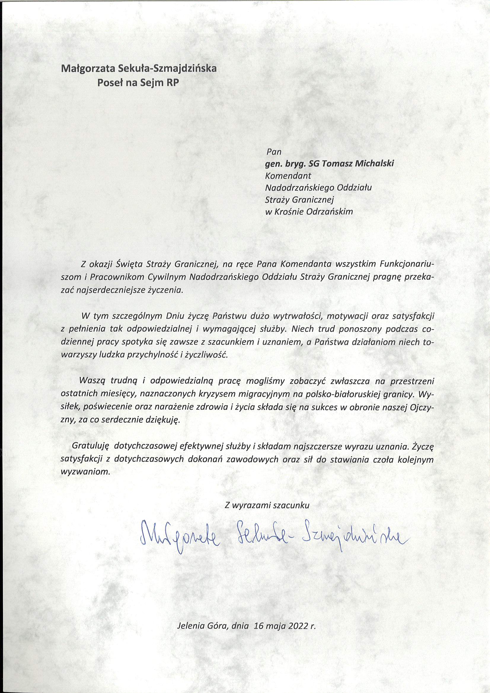 Życzenia skierowane przez Panią Poseł na Sejm RP Małgorzatę Sekułę-Szmajdzińską -