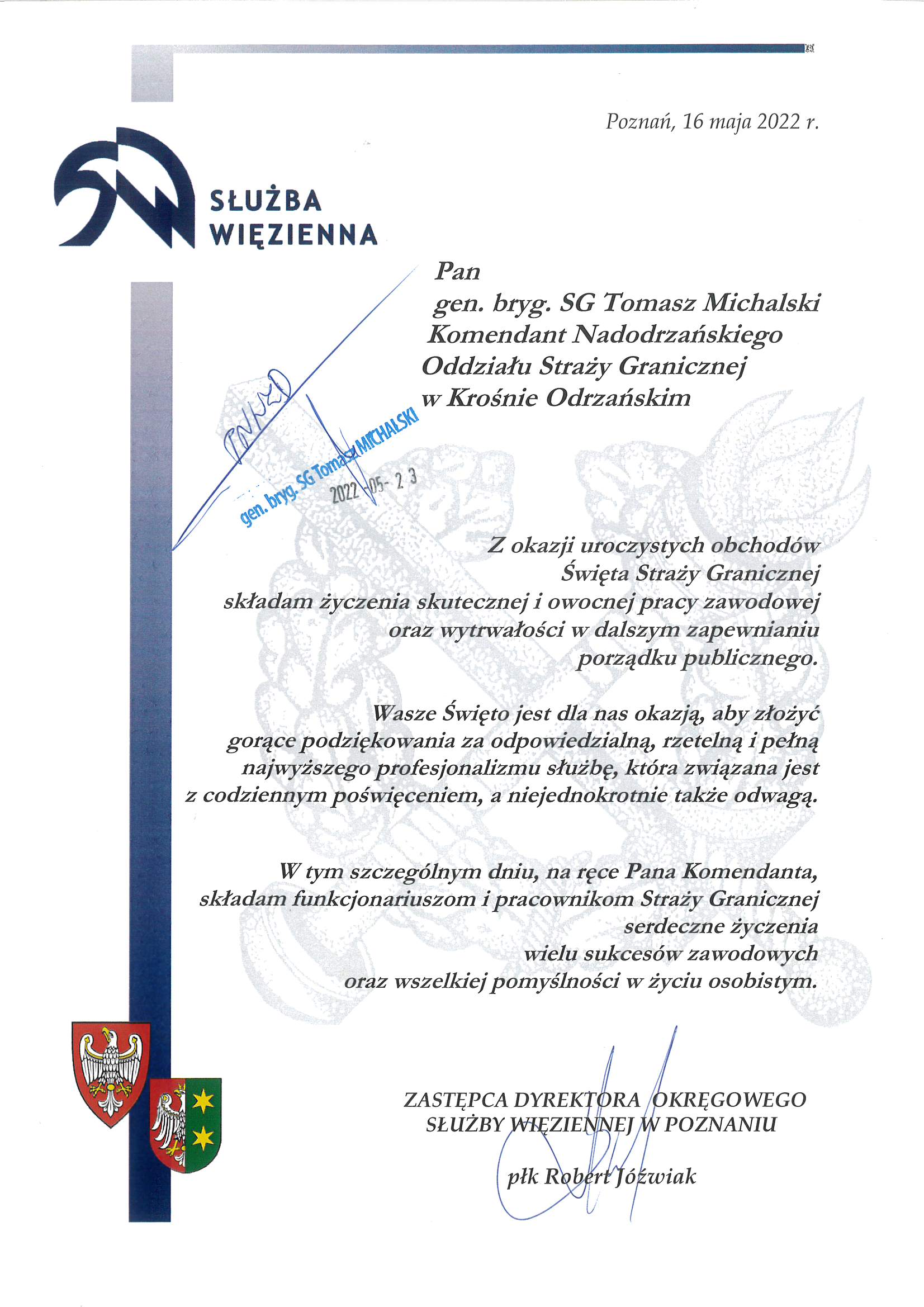 Życzenia skierowane przez Zastępcę Dyrektora Okręgowego Służby Więziennej w Poznaniu -