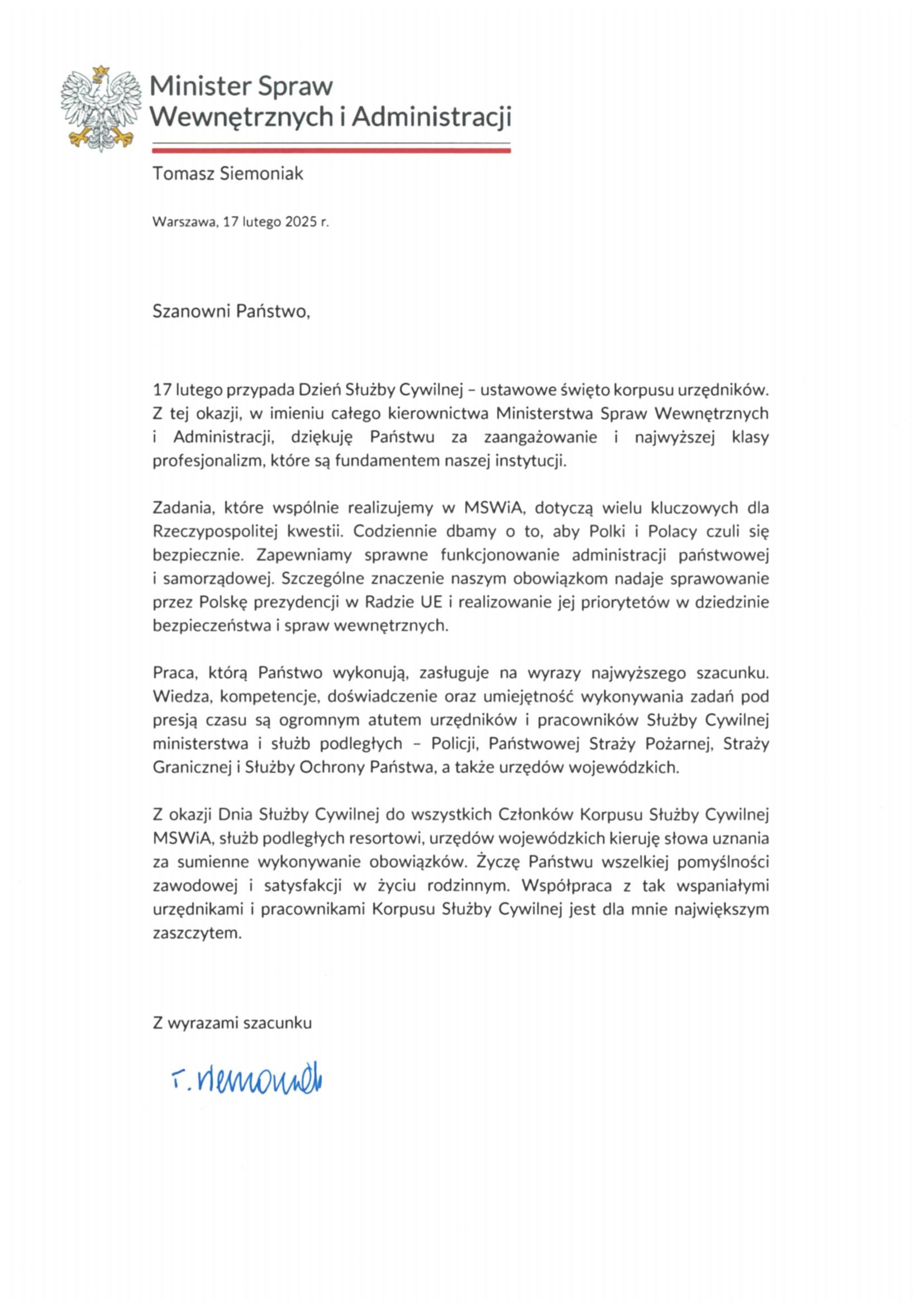 List Ministra Spraw Wewnętrznych i Administracji Tomasza Siemoniaka z okazji Dnia Służby Cywilnej.