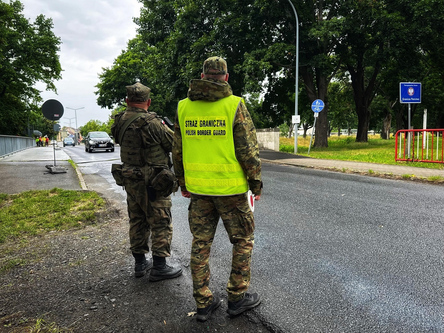 Funkcjonariusze Nadodrzańskiego Oddziału Straży Granicznej za służbami wspomagającymi podczas tymczasowej kontroli granicznej na polsko-niemieckiej granicy -