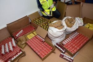 Funkcjonariusze postanowili przeszukać również pomieszczenie, z którego wynoszono pakunki i ujawnili tutaj kolejne 430 paczek papierosów różnych marek, 15 kartonów zawierających 200 sztuk papierosów, 59 woreczków z krajanką tytoniową i 46 butelek spirytusu.