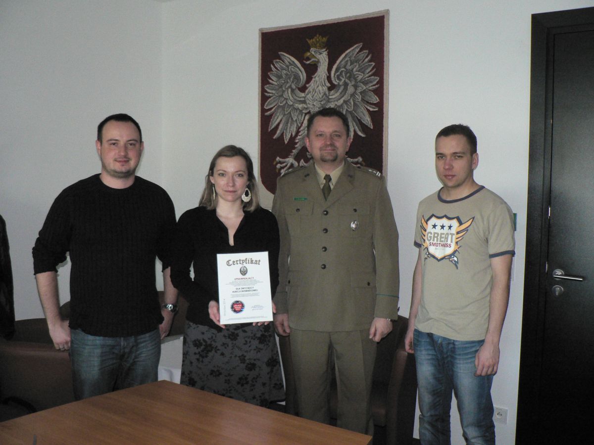 Komendant PSG we Wrocławiu-Strachowicach ppłk SG Artur Maliński wręczył zwyciężczyni licytacji pamiątkowy certyfikat oraz podziękował za okazaną pomoc i wsparcie finansowe Wielkiej Orkiestrze Świątecznej Pomocy.