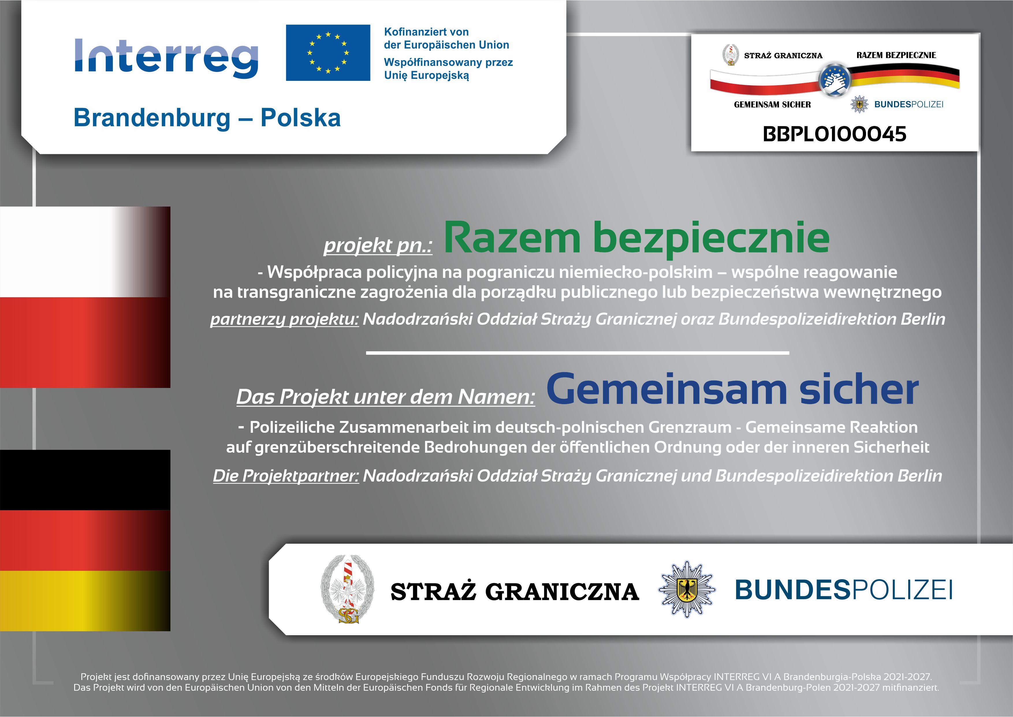 18 i 19 lutego w Alt Madlitz (Niemcy) odbyła się polsko – niemiecka sesja szkoleniowa realizowana przez Nadodrzański Oddział Straży Granicznej i Dyrekcję Policji Federalnej Niemiec w Berlinie pt. Razem bezpiecznie - Współpraca policyjna na pograniczu niemiecko-polskim - wspólne reagowanie na transgraniczne zagrożenia dla porządku publicznego lub bezpieczeństwa wewnętrznego, współfinansowana przez Unię Europejską ze środków Europejskiego Funduszu Rozwoju Regionalnego w ramach Programu Współpracy INTERREG VI A Brandenburgia-Polska 2021 - 2027.