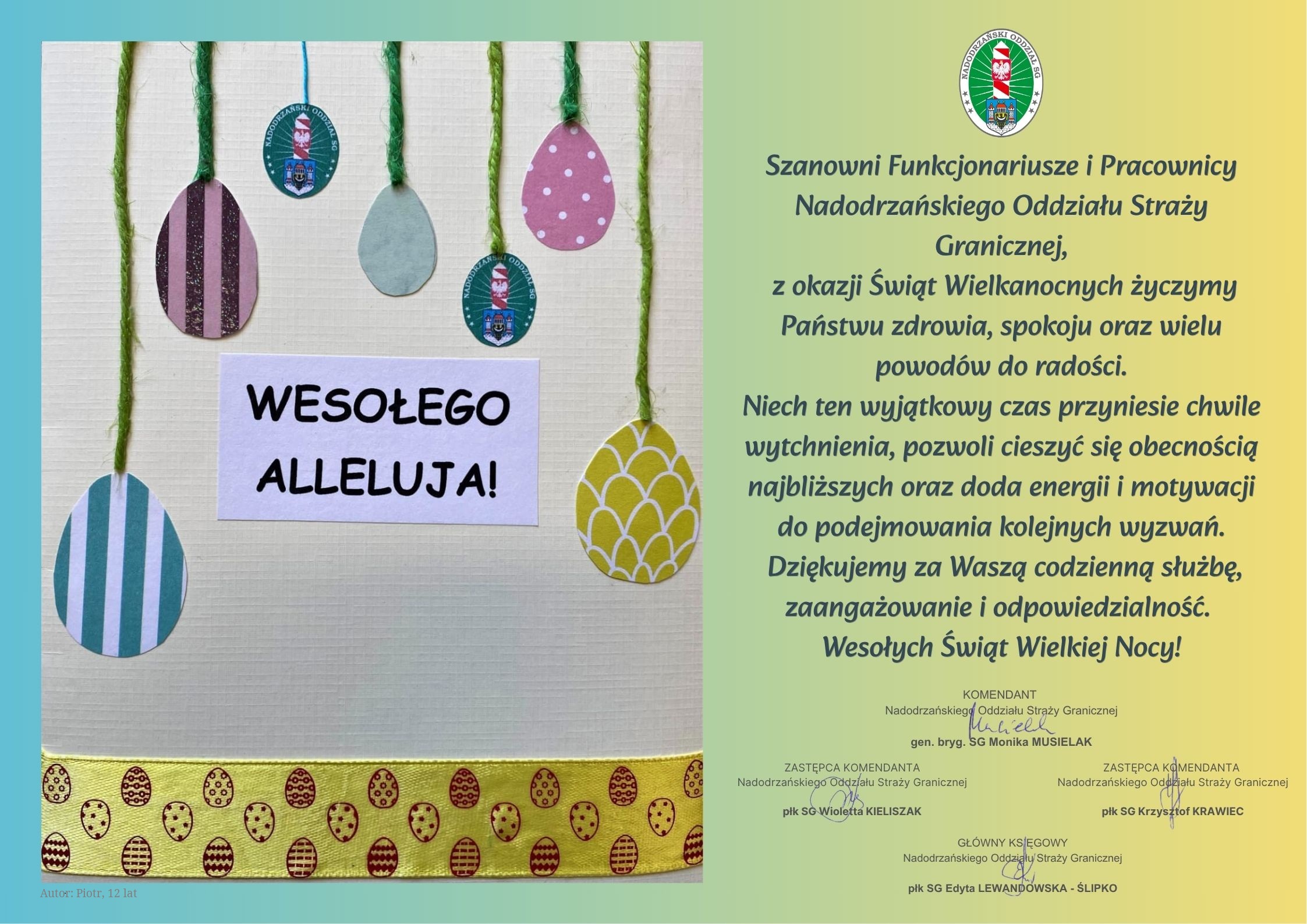 Kierownictwo Nadodrzańskiego Oddziału Straży Granicznej składa życzenia z okazji Świąt Wielkanocnych.