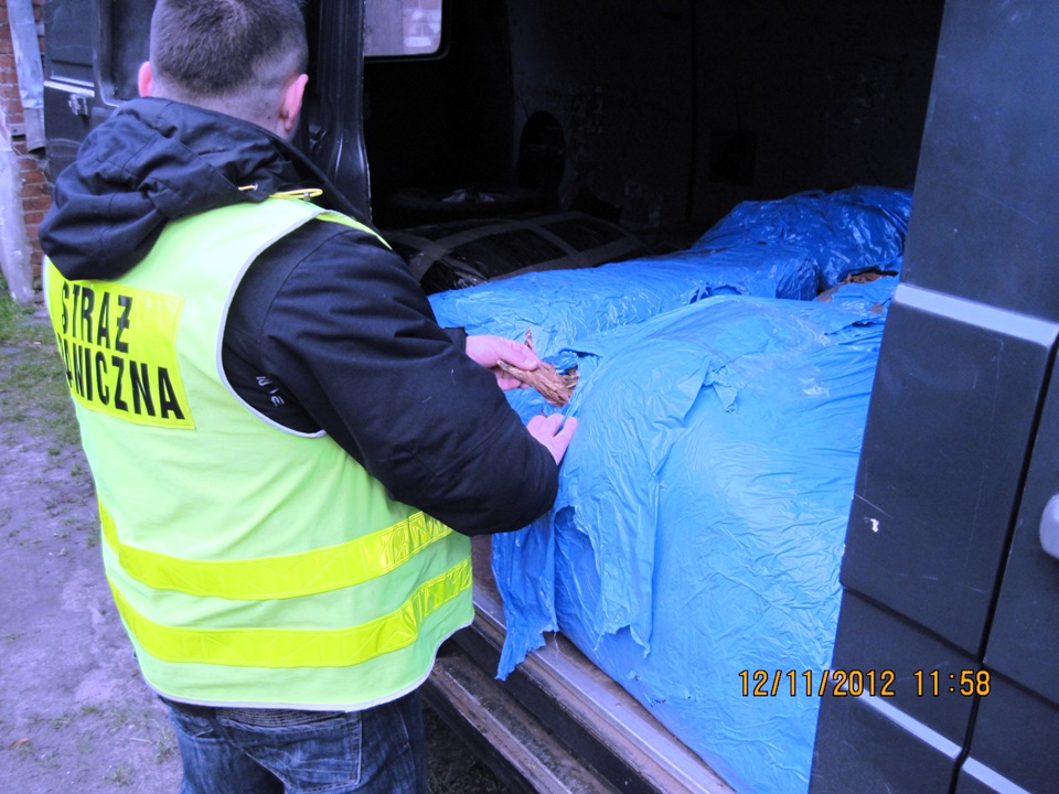 Funkcjonariusze Straży Granicznej z Placówki w Szczecinie wraz z funkcjonariuszami Izby Celnej ujawnili 6 balotów liści tytoniu w trakcie kontroli jednego z samochodów ciężarowych prowadzonej w Szczecinie. Idąc tym tropem sprawdzili posesję, na którą wjeżdżał. Ich przypuszczenia się potwierdziły. W jednym z pomieszczeń gospodarczych ujawnili maszynę do krojenia tytoniu oraz krajankę tytoniu. Łącznie ujawniliśmy 7 kilogramów krajanki tytoniu bez polskich znaków akcyzy skarbowej oraz prawie 300 kilogramów liści tytoniu przeznaczonych do cięcia. Łączna wartość nielegalnego towaru to około 10 000 zł. Towar wraz z maszyną zgodnie z właściwością zabezpieczyli funkcjonariusze Izby Celnej ze Szczecina.