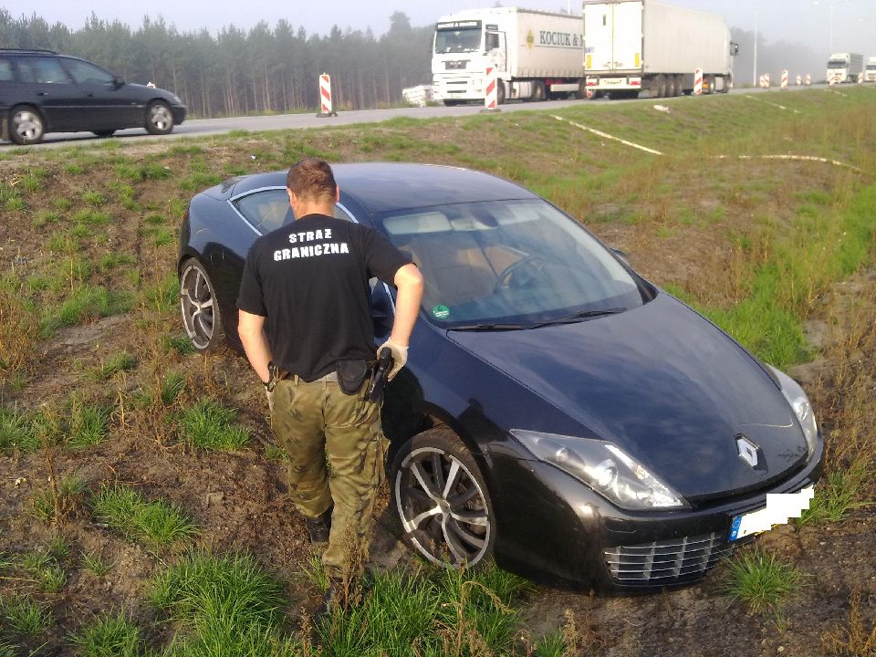 Pół godziny wcześniej ci sami funkcjonariusze wytypowali do kontroli osobowego Renault. I w tym przypadku kierowca na widok tarczki stop zdecydowanie przyspieszył. Patrol wszczął pościg. Kierowca łamał przepisy ruchu drogowego, zajeżdżając drogę innym kierowcom. Z powodu swej brawury uderzył w słupek odgradzający pasy ruchu co spowodowało uszkodzenie lewej przedniej i tylnej felgi kół samochodu. Pojazd wjechał do przydrożnego rowu. Jak się okazało figurował w bazie danych jako skradziony na terenie Niemiec. Jego wartość to około 70 000 zł.