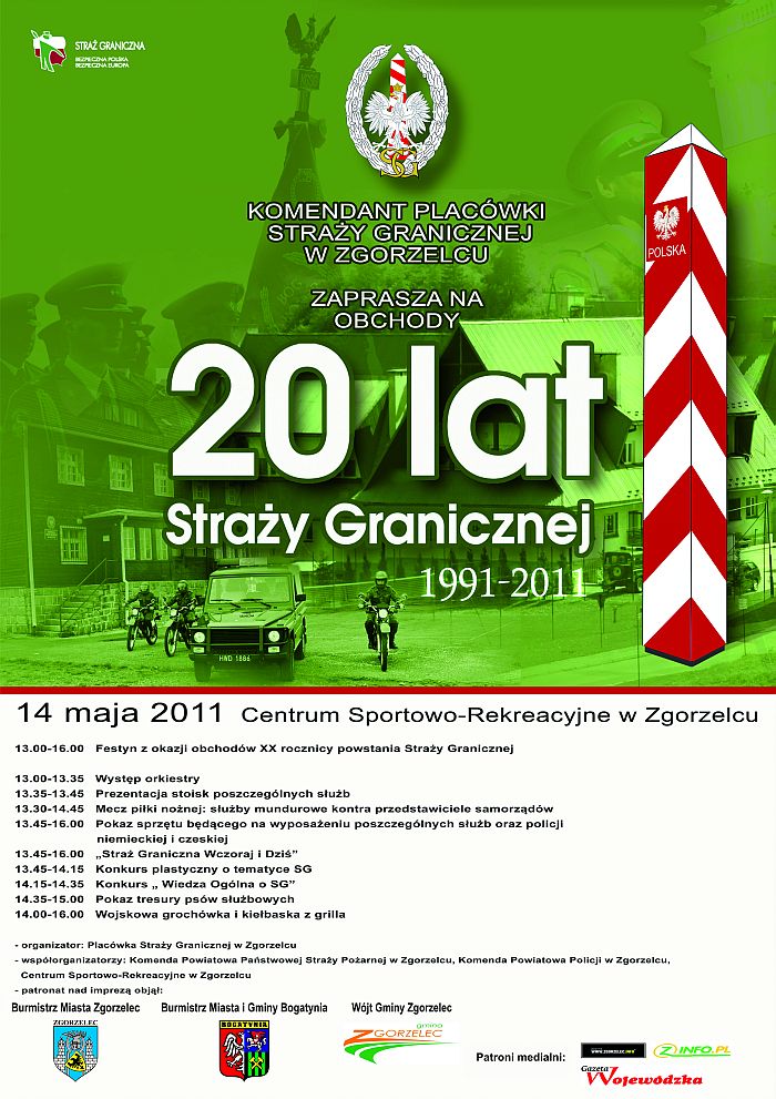 Aby uczcić XX lecie powstania naszej formacji w dniu 14 maja 2011 roku w godzinach od 13.00 do 16.00 na terenie Centrum Sportowo – Rekreacyjnego w Zgorzelcu organizujemy festyn z okazji obchodów XX rocznicy powstania Straży Granicznej, na który serdecznie zapraszamy wszystkich przyjaciół i miłośników Straży Granicznej.