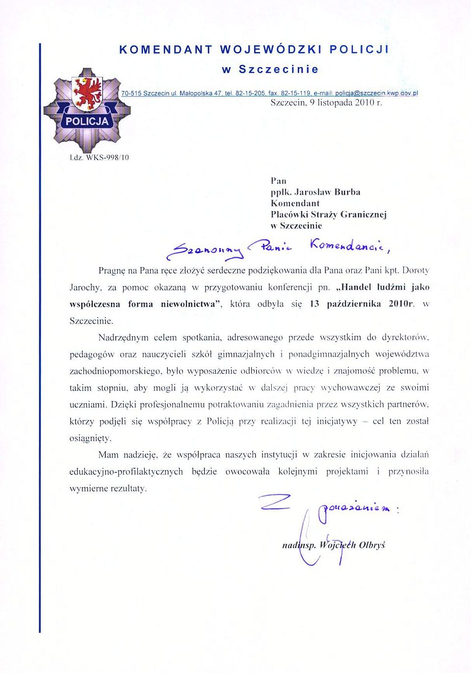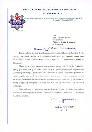 Komenda Wojewódzka Policji w Szczecinie we współpracy w MSWiA i Urzędem Marszałkowskim Województwa Zachodniopomorskiego zorganizowała w dniu 13.10.2010 r. konferencję poświęconą zjawisku handlu ludźmi w ramach prowadzonego wieloletniego programu profilaktyki prowadzonego na terenie Pomorza Zachodniego.