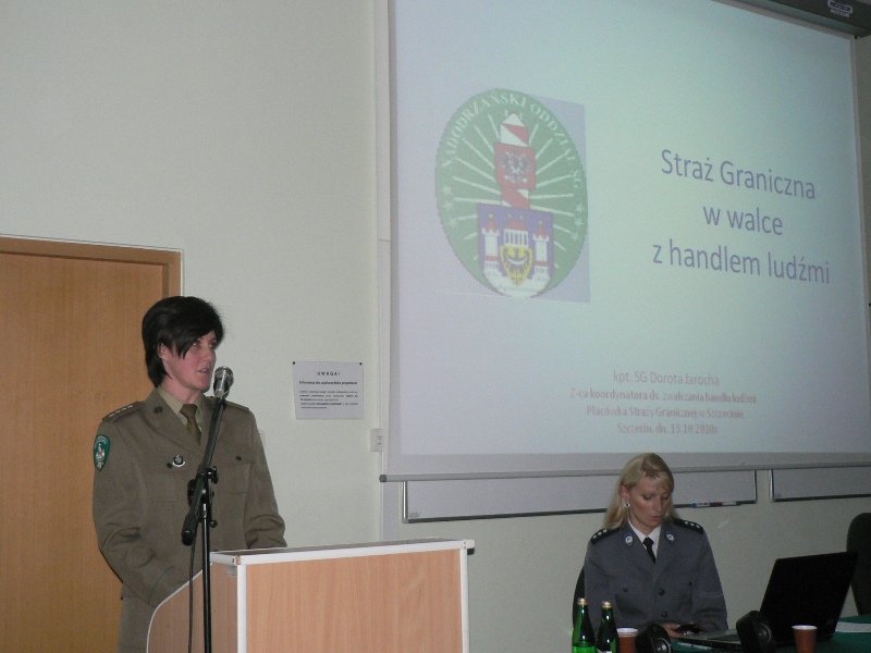 Według przedstawionych danych Polska jest krajem pochodzenia, tranzytu i przeznaczenia ofiar handlu ludźmi. Statystyki szacują, że proceder ten może dotyczyć nawet 15.000 osób przewożonych, przywożonych, wywożonych i będących „przedmiotem” handlu w naszym kraju. Ze strony Placówki SG w Szczecinie, informacje o sposobie przeciwdziałania straży granicznej handlowi ludźmi oraz o dokumentach uprawniających do przekraczania granicy obywateli Polski, przedstawiła Pani kpt. SG Dorota Jarocha – zastępca koordynatora ds. zwalczania handlu ludźmi.