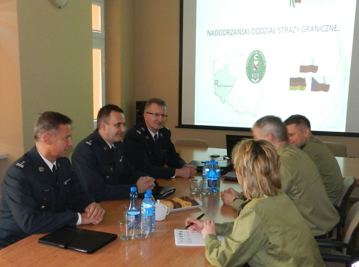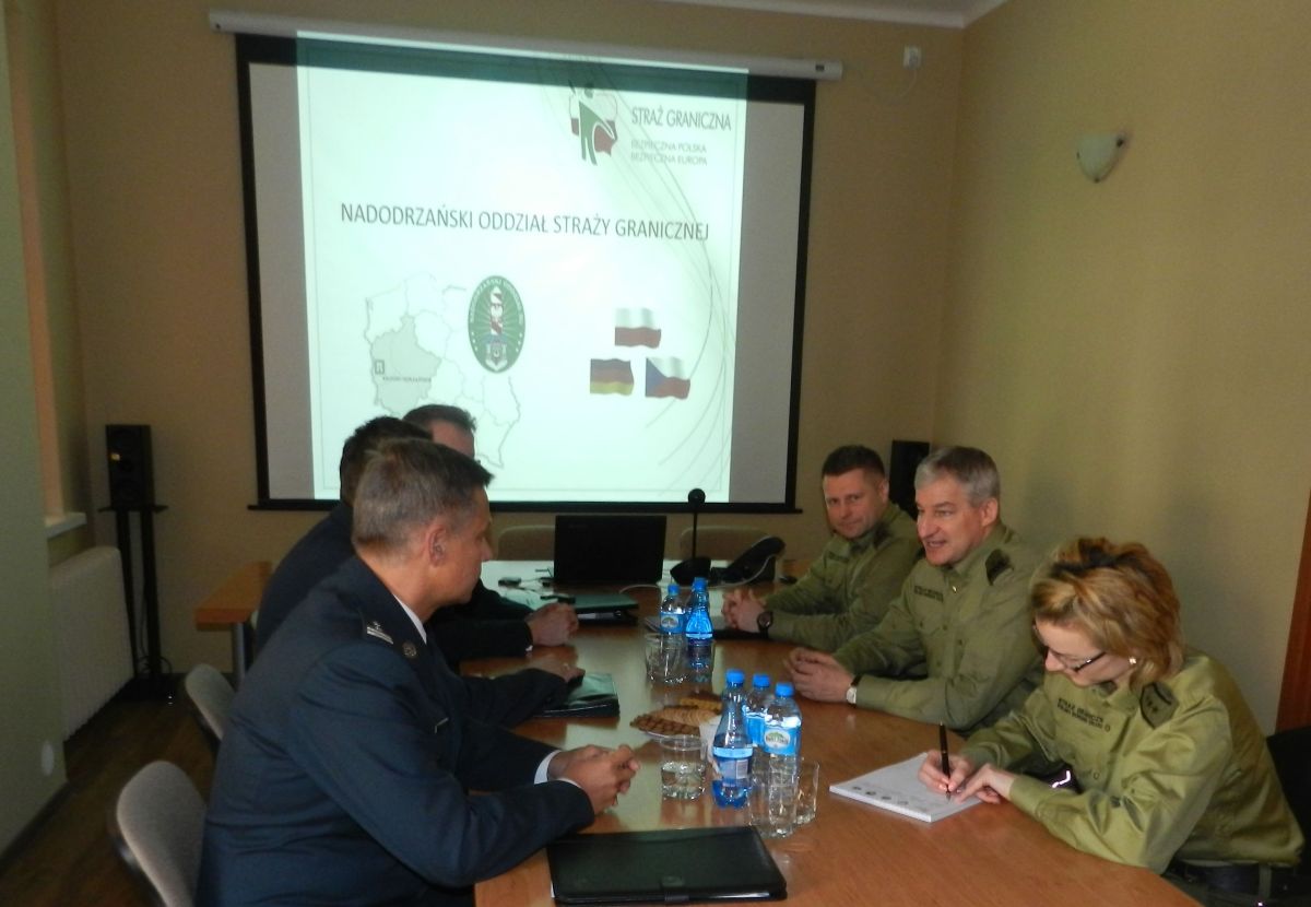 Na rozmowy o współpracy przybyli do Komendy Nadodrzańskiego Oddziału SG w Krośnie Odrzańskim dyrektor Izby Celnej w Poznaniu młodszy inspektor Sylwester Skórski, pełniący obowiązki dyrektora Izby Celnej w Rzepinie młodszy inspektor Krzysztof Bieniarz oraz zastępca dyrektora Izby Celnej we Wrocławiu podinspektor Marek Wąsik.