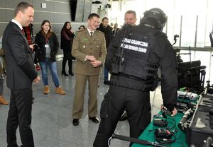 Funkcjonariusze Straży Granicznej z wrocławskiej placówki w krótkim pokazie zaprezentowali umiejętności nowego robota, przedstawili również wojewodzie inny sprzęt wykorzystywany podczas działań i w codziennej służbie.