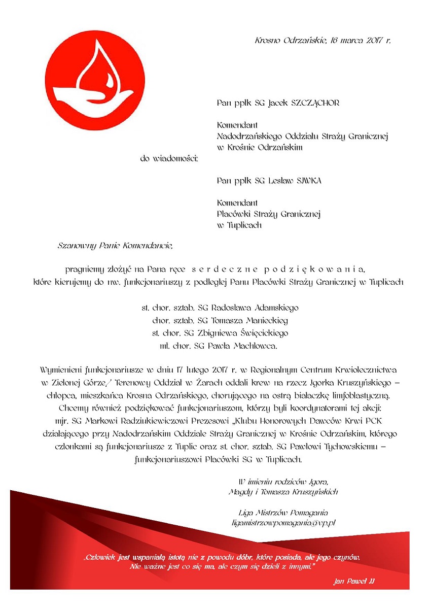 Na ręce Komendanta Nadodrzańskiego Oddziału SG ppłk SG Jacka Szcząchora oraz Komendanta Placówki SG w Tuplicach ppłk SG Lesława Siwki wpłynęły podziękowania od rodziców chorego Igora. Chłopiec obecnie przebywa w Klinice Transplantacji Szpiku, Onkologii i Hematologii Dziecięcej „Przylądek Nadziei” Uniwersyteckiego Szpitala Klinicznego im. Jana Mikulicza-Radeckiego we Wrocławiu.
