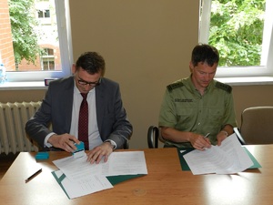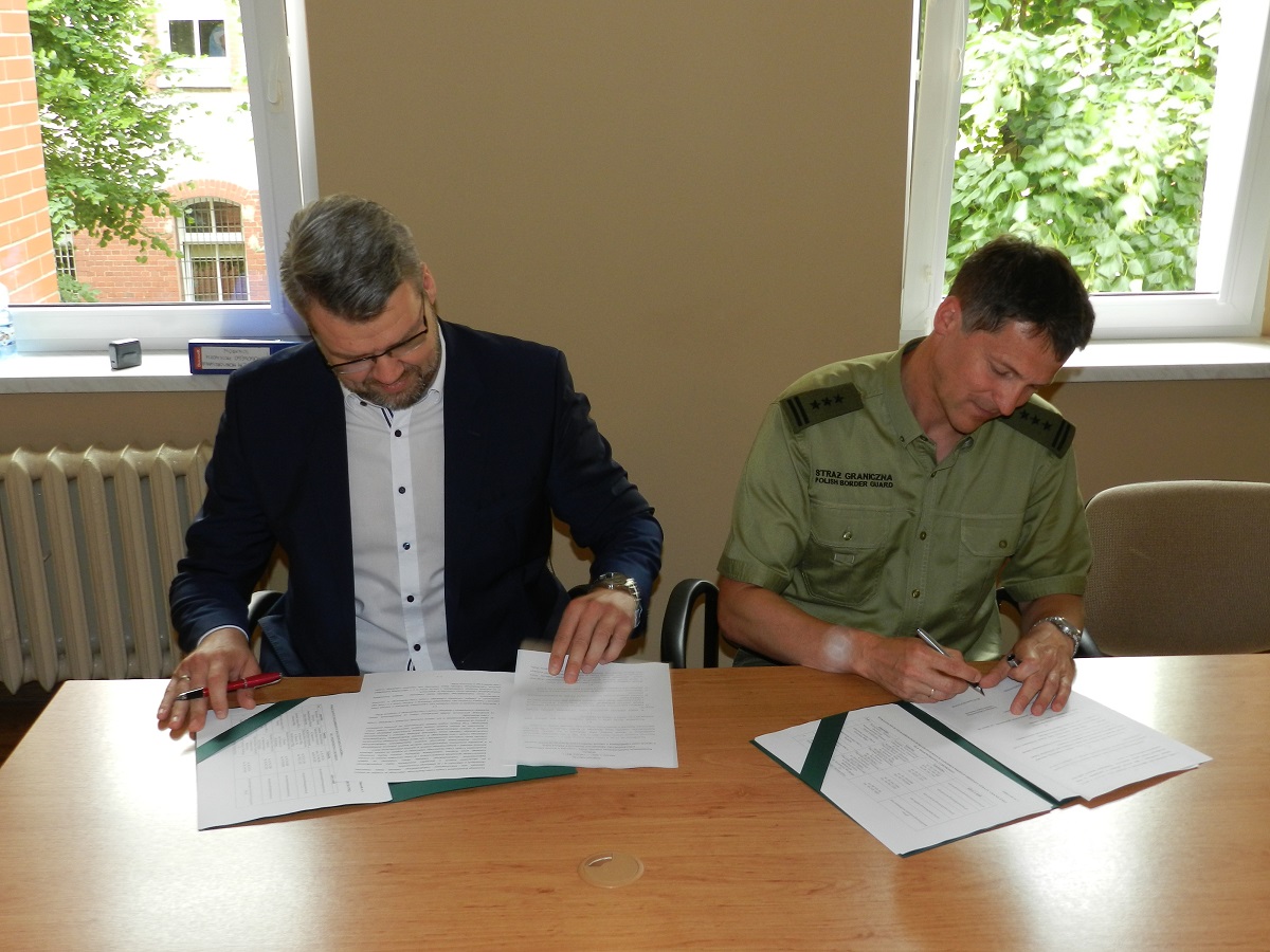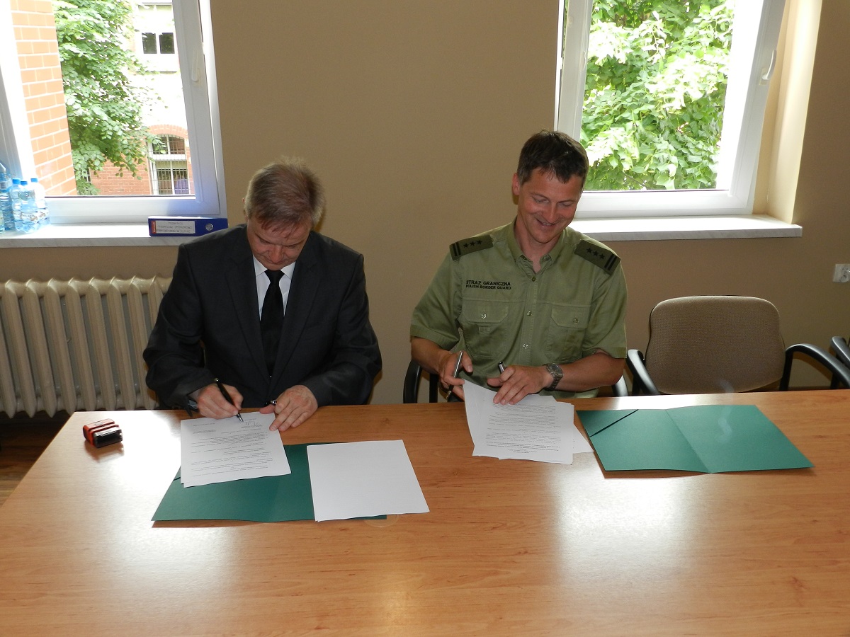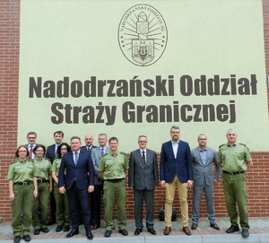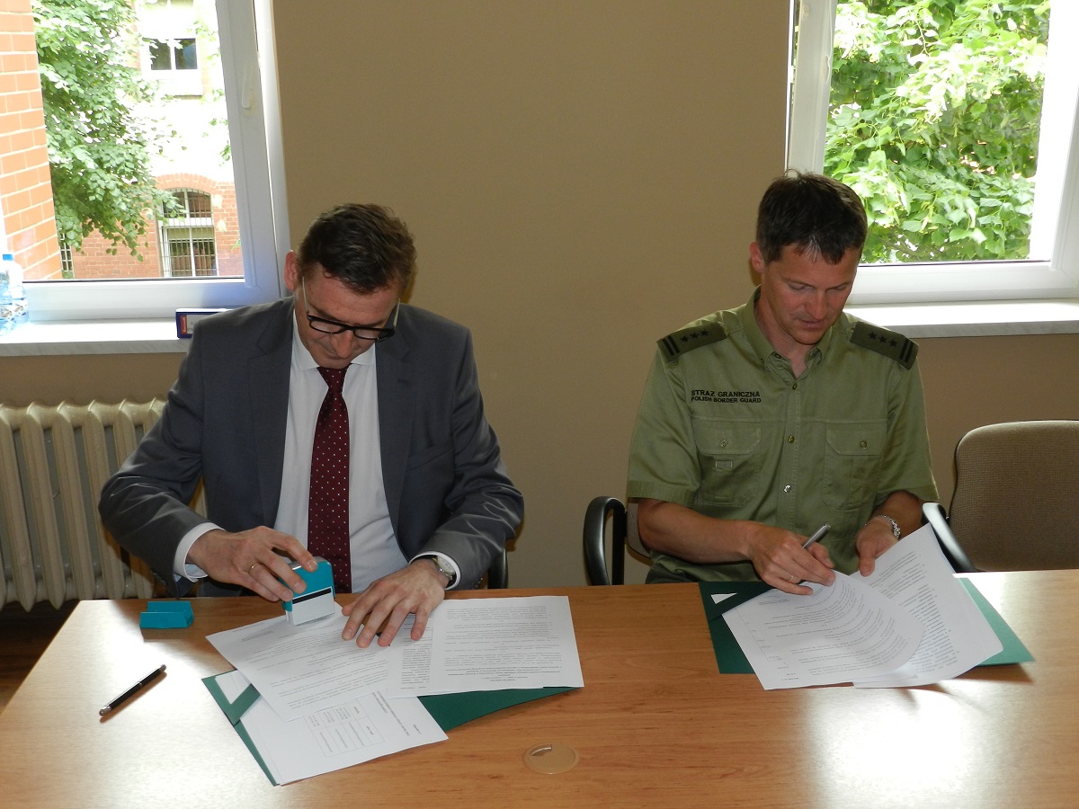 13 czerwca 2017 r. w Komendzie Nadodrzańskiego Oddziału Straży Granicznej w Krośnie Odrzańskim płk SG Jacek Szcząchor - Komendant Nadodrzańskiego Oddziału Straży Granicznej oraz Pan Sławomir Groch – zastępca Dyrektora Izby Administracji Skarbowej w Poznaniu, Pan Adam Andrzejewski - Dyrektor Izby Administracji Skarbowej w Zielonej Górze oraz Pan Józef Dolata - Dyrektor Izby Administracji Skarbowej we Wrocławiu podpisali porozumienia dotyczące zasad współdziałania. Porozumienie określa zakres i warunki współpracy przy realizacji zadań określonych w ustawie z dnia 9 marca 2017 r. o systemie monitorowania drogowego przewozu towarów oraz między innymi zasady prowadzenia wspólnych działań, przedsięwzięć, szkoleń oraz wzajemną wymianę informacji w sprawach i zagadnieniach związanych z realizowanymi zadaniami ustawowymi. Taka współpraca z pewnością będzie miała wpływ na poprawę skuteczności działań realizowanych przez funkcjonariuszy SG oraz KAS na terenie województwa lubuskiego, wielkopolskiego i dolnośląskiego.