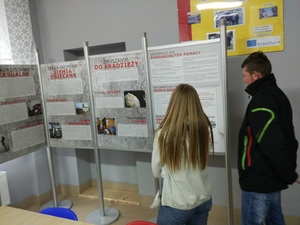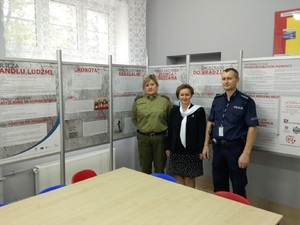 Dzięki uprzejmości Dyrektora Zespołu Szkół Ponadgimnazjalnych Pani Barbary Kołarzyk, Koordynator ds. Zapobiegania i Zwalczania Handlu Ludźmi Nadodrzańskiego Oddziału Straży Granicznej – kpt. SG Małgorzata Maciejewska wraz z asp. szt. Mariuszem Matuszewskim z Komendy Powiatowej Policji w Krośnie Odrzańskim zaprezentowali uczniom wystawę „Oblicza handlu ludźmi”. Autorem i wykonawcą wystawy jest Ministerstwo Spraw Wewnętrznych i Administracji. Do jednych z wielu zadań Straży Granicznej i Policji należy zwalczanie przestępstwa handlu ludźmi, który jest jedną z form współczesnego niewolnictwa. Funkcjonariusze od wielu lat zwalczają ten proceder, prowadzą czynności weryfikacyjne w ramach identyfikacji potencjalnych ofiar. Zgodnie z Krajowym Planem Działań Przeciwko Handlowi Ludźmi, Straż Graniczna i Policja prowadzą szeroko rozumianą profilaktykę wśród różnych grup społecznych i zawodowych, czego wyrazem jest także wystawa pn. „Oblicza handlu ludźmi”, którą teraz mogą obejrzeć uczniowie. Wystawa powstała w ramach realizowanego projektu „Poprawa zdolności Polski do walki z handlem ludźmi”, dofinansowanego z Norweskiego Mechanizmu Finansowego. Celem tego projektu jest podnoszenie świadomości zagrożeń związanych z handlem ludźmi wśród obywateli Polski poprzez wykorzystanie narzędzi dopasowanych do określonych grup docelowych. Jednym z elementów tego projektu jest właśnie organizacja wystawy mobilnej na terenie kilku wybranych województw. Województwo lubuskie, z racji położenia przygranicznego, jak również wykazywanego zaangażowania w działania dot. przeciwdziałania handlowi ludźmi, zostało wytypowane do organizacji tej wystawy. Wystawa składała się z 6 plansz, na których zaprezentowano ogólne informacje czym jest handel ludźmi, gdzie szukać pomocy, a także przedstawiono przykłady form wykorzystania, m.in. pracę przymusową, wykorzystanie seksualne, zmuszanie do kradzieży. Zamieszczone na planszach fotografie nie są stylizowane, lecz pochodzą z autentycznego materiału zebranego przez służby w toku działań operacyjnych, podczas ścigania przestępstwa handlu ludźmi .
