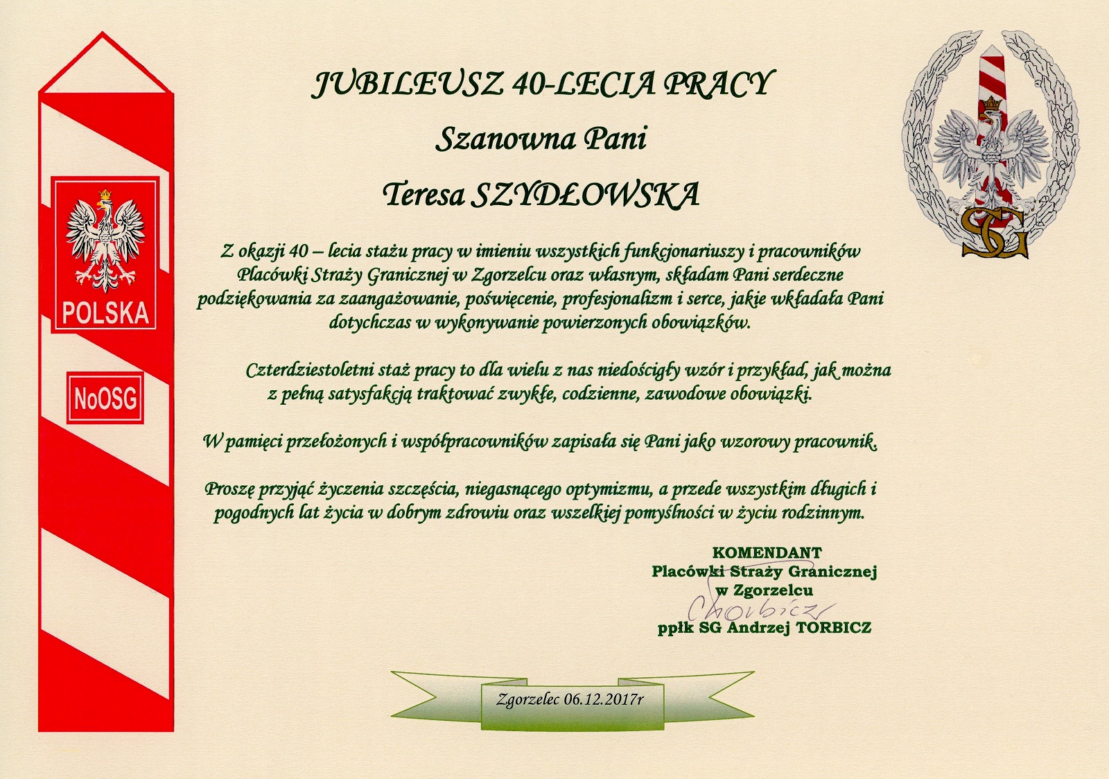 Komendant Placówki SG w Zgorzelcu ppłk Andrzej Torbicz w imieniu swoim, Komendanta Nadodrzańskiego Oddziału SG, Związku Zawodowego Pracowników Cywilnych MSWiA, a także wszystkich funkcjonariuszy i pracowników, wręczając listy gratulacyjne i kwiaty, podziękował Paniom Teresie Szydłowskiej oraz Dorocie Biały za obowiązkowość i rzetelne podejście do wykonanych na co dzień obowiązków oraz złożył najserdeczniejsze życzenia zdrowia, satysfakcji z pracy, a także kolejnych jubileuszy oraz pomyślności na kolejnych etapach życia zawodowego i prywatnego.