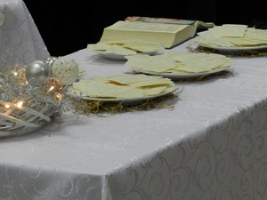 Jego Ekscelencja Biskup Zielonogórsko-Gorzowski Tadeusz Lityński pobłogosławił opłatek, którym podzielili się wszyscy zebrani. Przy słowach radosnych kolęd wszyscy zebrani życzyli sobie spokojnych świąt, dziękując też za to, co za nami.