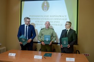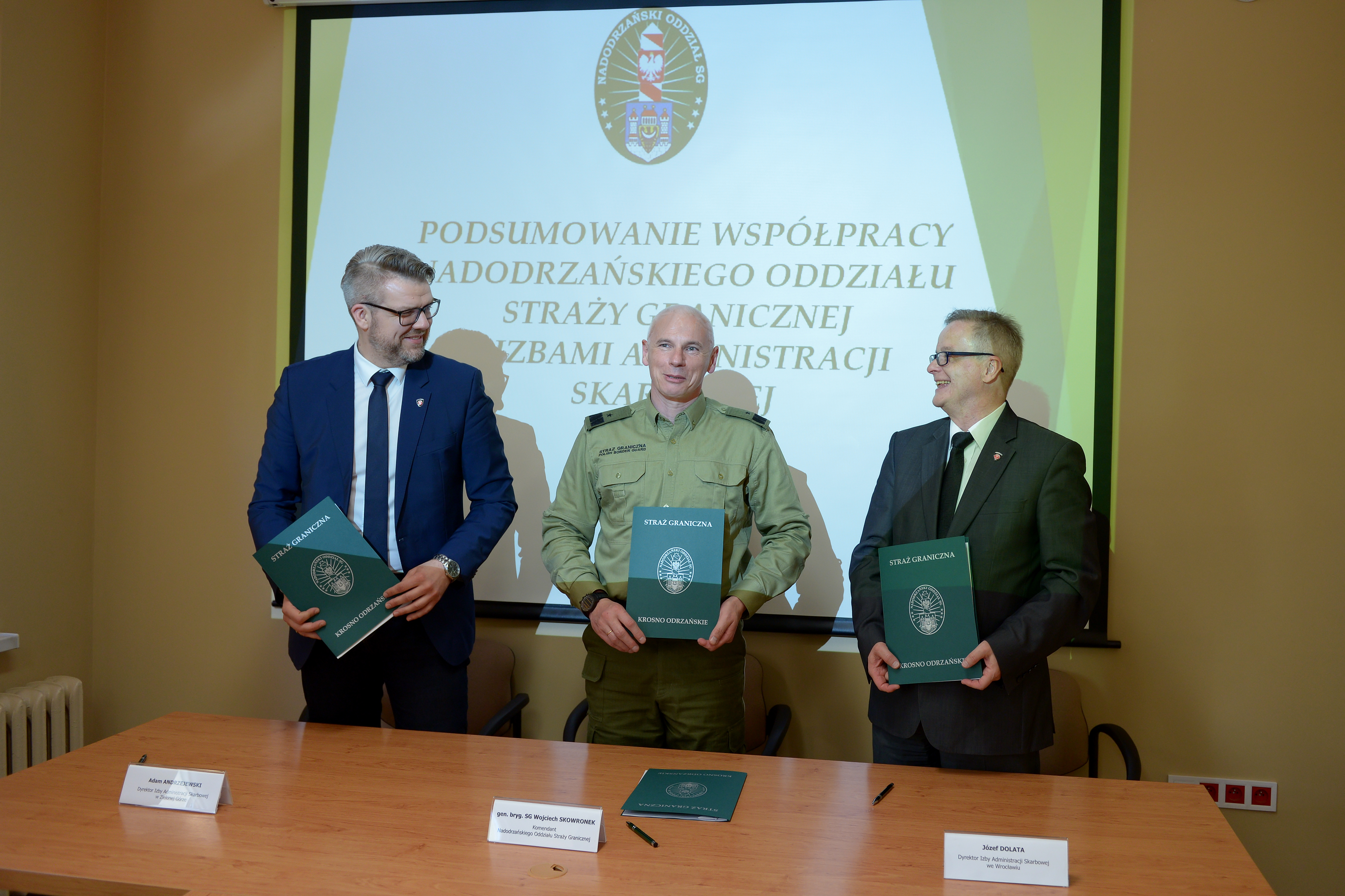 20 kwietnia 2018 r. w Komendzie Nadodrzańskiego Oddziału Straży Granicznej w Krośnie Odrzańskim gen. bryg. SG Wojciech Skowronek - Komendant Nadodrzańskiego Oddziału Straży Granicznej oraz Pan Adam Andrzejewski - Dyrektor Izby Administracji Skarbowej w Zielonej Górze oraz Pan Józef Dolata - Dyrektor Izby Administracji Skarbowej we Wrocławiu podpisali porozumienia dotyczące zasad współdziałania.