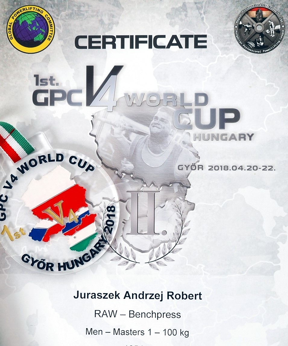 W rozgrywanym w dniach 20-22 kwietnia 2018 roku, w węgierskiej miejscowości Győr, Pucharze Świata GPC V4, uczestniczyło łącznie 470 zawodników z czternastu krajów. W zawodach tych wystartowała również reprezentacja klubu sportowego "SUDETY" Międzylesie, której zawodnikami są m.in. funkcjonariusz z Placówki SG w Kłodzku mł.chor. SG Andrzej Juraszek oraz były funkcjonariusz, również z Placówki SG w Kłodzku Krzysztof Halczyk. W drugim dniu zawodów w rywalizacji sportowców wyciskających sztangę leżąc RAW uczestniczyło 130 osób. Andrzej Juraszek wywalczył srebro w kategorii wagowej do 100 kg w grupie Masters 40-44 z wynikiem 165 kg. Jest to kolejny sukces naszego siłacza, który startuje od 24 lat i niezawodnie zajmuje miejsca na podium. Natomiast nasz były funkcjonariusz Krzysztof Halczyk zdobył złoty medal kategorii Masters 40-44 wycisnął 172.5 kg i zajął III miejsce w kat. do 140 kg.