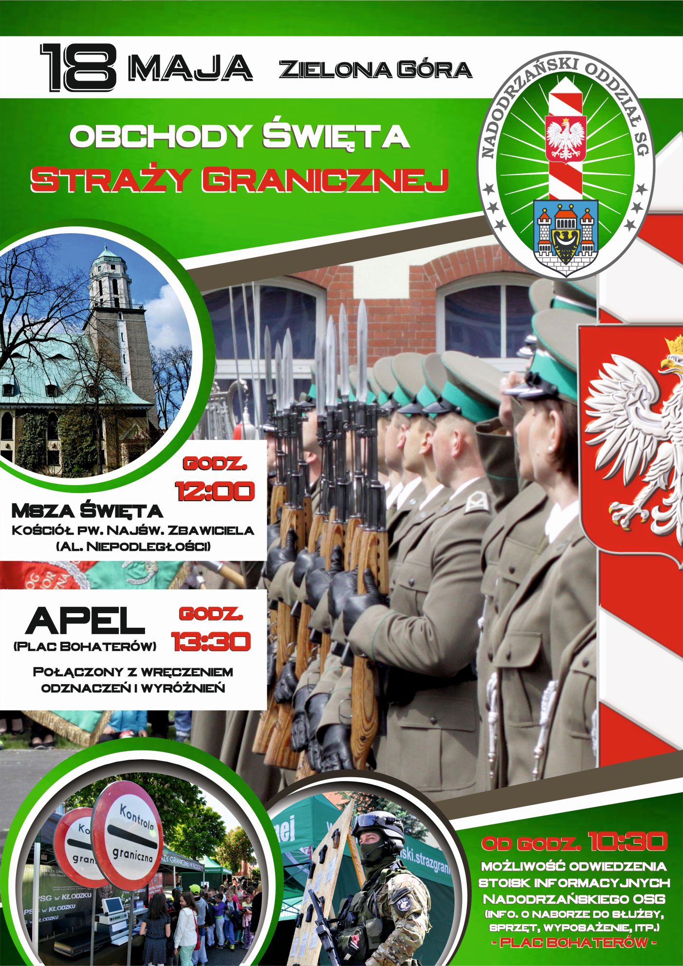 Obchody rozpoczną się o godzinie 12.00 msza święta w intencji funkcjonariuszy i pracowników Nadodrzańskiego Oddziału Straży Granicznej w Kościele pw. Najświętszego Zbawiciela w Zielonej Górze. Następnie o godz. 13.30 na Placu Bohaterów odbędzie się uroczysty apel z okazji 27 rocznicy utworzenia Straży Granicznej. Obchody uświetni obecność orkiestry wojskowej z Żagania. Od godz. 10.30 na Placu Bohaterów dla wszystkich chętnych będzie istniała możliwość odwiedzenia stoisk informacyjnych Nadodrzańskiego Oddziału SG, zapoznania się ze specyfiką służby funkcjonariuszy, obejrzenia sprzętu oraz pojazdów służbowych będących na wyposażeniu SG.