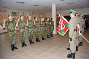 Płk SG Tomasz Michalski – Zastępca Komendanta Nadodrzańskiego Oddziału Straży Granicznej odebrał ślubowanie od 7 funkcjonariuszy. Uroczystość odbyła się w Komendzie NoOSG w Krośnie Odrzańskim z udziałem pocztu sztandarowego, kadry kierowniczej i rodzin funkcjonariuszy. Zastępca Komendanta pogratulował ślubującym wstąpienia w szeregi Nadodrzańskiego Oddziału Straży Granicznej i wyraził nadzieję, że słowa roty ślubowania staną się dla nich zobowiązaniem do wytrwałej służby dla naszej ojczyzny. Podkreślił, że zakładając mundur funkcjonariusza Straży Granicznej należy pamiętać, by nosić go z dumą i szacunkiem. Zaznaczył, że każdy funkcjonariusz powinien strzec dobrego imienia służby, honoru i godności. Płk SG Tomasz Michalski skierował również podziękowania i gratulacje rodzicom ślubujących funkcjonariuszy, a także prosił, aby wspierali nowo przyjętych funkcjonariuszy w drodze, którą wybrali. Już za kilka dni funkcjonariusze, którzy dzisiaj ślubowali, rozpoczną kilkumiesięczne szkolenie, po którym zostaną skierowani do pełnienia służby w wybranych Placówkach Nadodrzańskiego Oddziału Straży Granicznej.