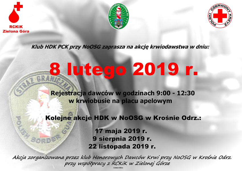 Klub HDK PCK przy Nadodrzańskim Oddziale Straży Granicznej zaprasza w dniu 8 lutego 2019 roku do honorowego oddawania krwi.