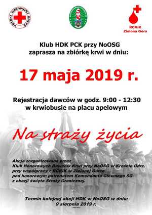 Klub HDK PCK przy Nadodrzańskim Oddziale Straży Granicznej zaprasza w dniu 17 maja 2019 roku do oddania krwi w trwającej ogólnopolskiej akcji honorowego oddawania krwi „NA STRAŻY ŻYCIA”
