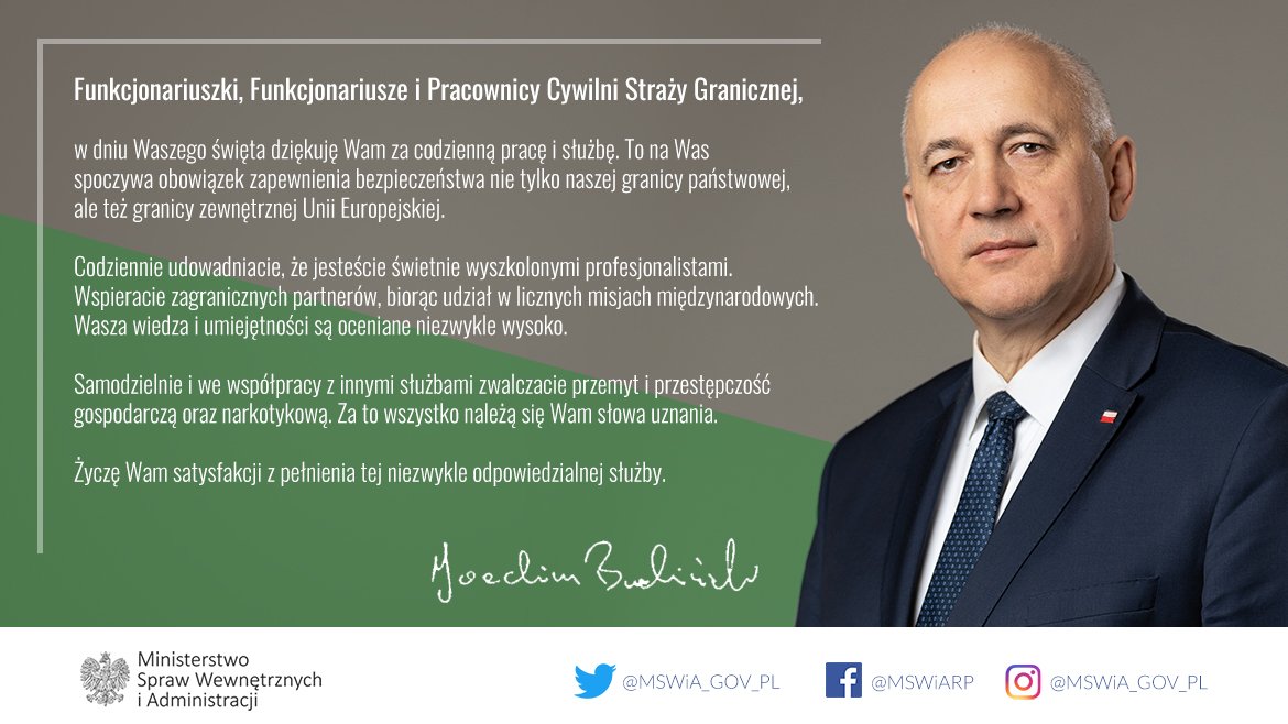Życzenia Ministra Spraw Wewnętrznych i Administracji Joachima Brudzińskiego z okazji Święta Straży Granicznej.