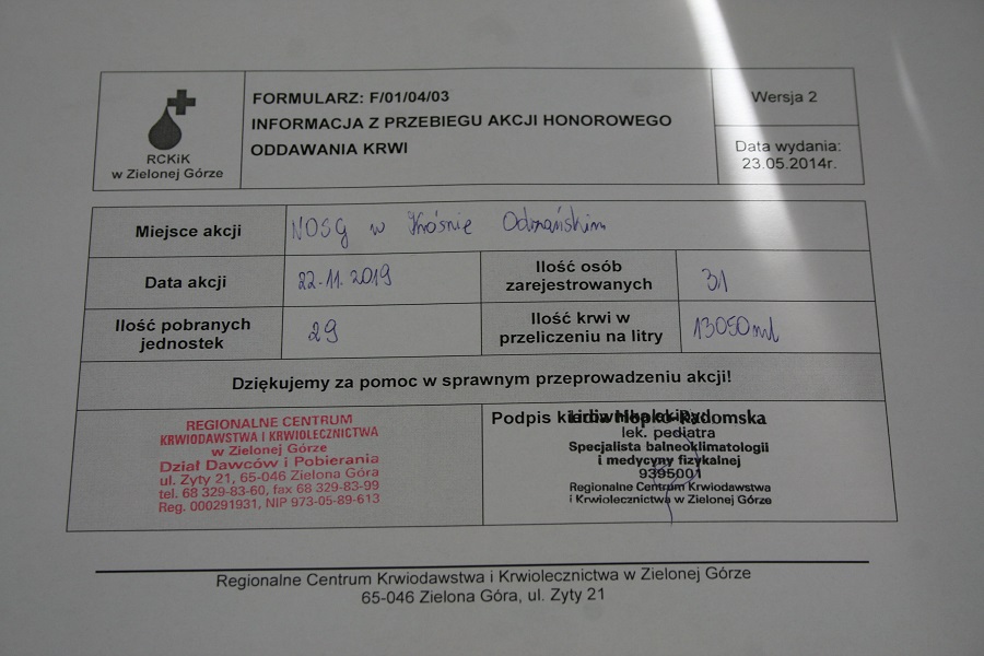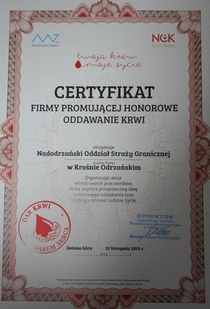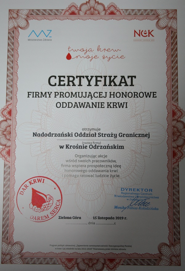 Warto zaznaczyć, że w tym roku, 15 listopada po raz kolejny Nadodrzański Oddział SG otrzymał Certyfikat Firmy Promującej Honorowe Oddawanie Krwi nadany przez Dyrektora Regionalnego Centrum Krwiodawstwa i Krwiolecznictwa w Zielonej Górze za organizowanie i wspieranie idei honorowego oddawania krwi.