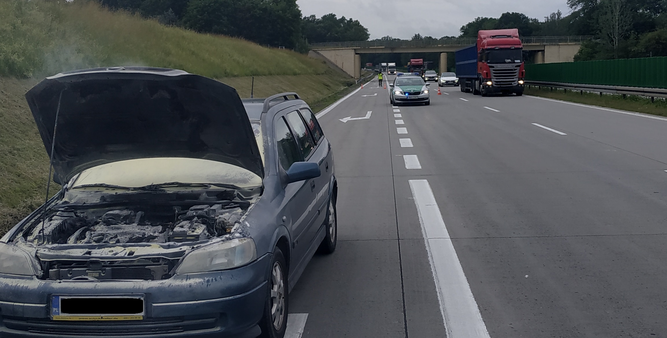 Funkcjonariusze z Placówki Straży Granicznej z Legnicy pełniąc wczoraj służbę (24 czerwca) zauważyli na autostradzie A-4 palący się samochód. Pojazd stał na poboczu 76 km trasy A4, w rejonie miejscowości Budziwojów.