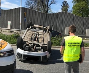 Chwilę przed godzina 14, funkcjonariusze Straży Granicznej z Wrocławia-Strachowic w okolicy zjazdu z drogi A8 w kierunku Wrocław-Oporów zauważyli wypadek drogowy jaki miał miejsce na rondzie. Ford Fusion w wyniku zderzenia z samochodem ciężarowym dachował. Funkcjonariusze SG jako pierwsi na miejscu przystąpili do zabezpieczenia miejsca zdarzenia blokując jeden pas drogi trójkątem ostrzegawczym. Udzielili kobiecie pomocy przedmedycznej i poinformowali służby ratunkowe. Dodatkowo z bagażnika pojazdu uwolnili psa pokrzywdzonej, który nie doznał widocznych obrażeń